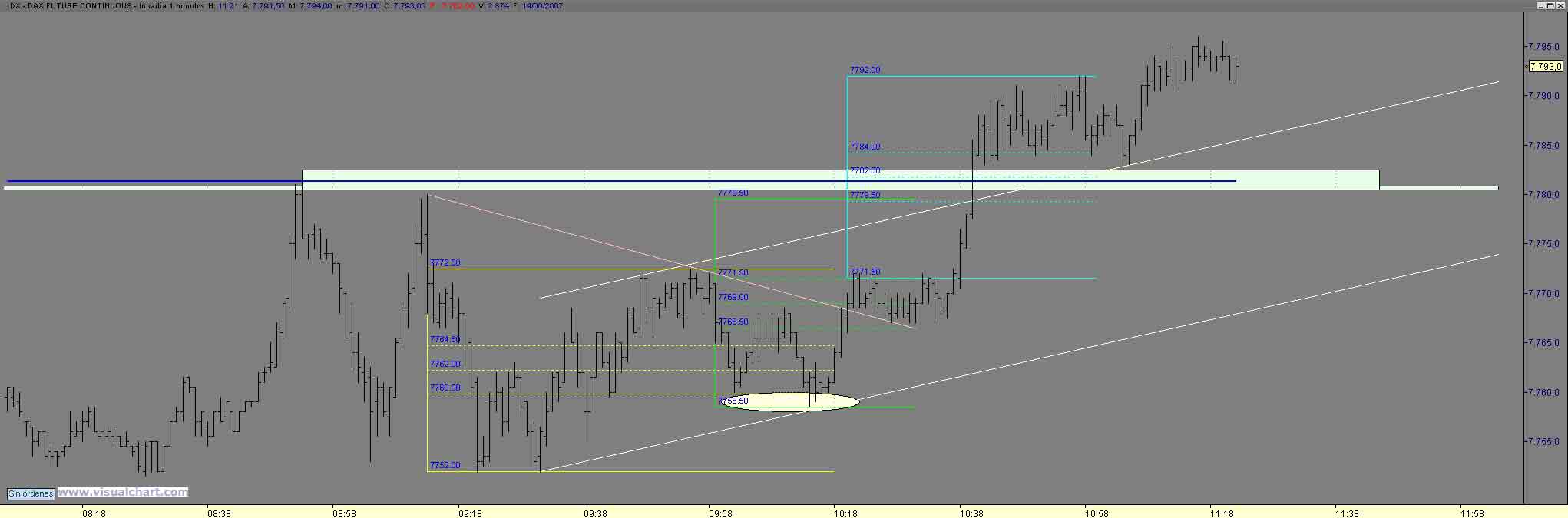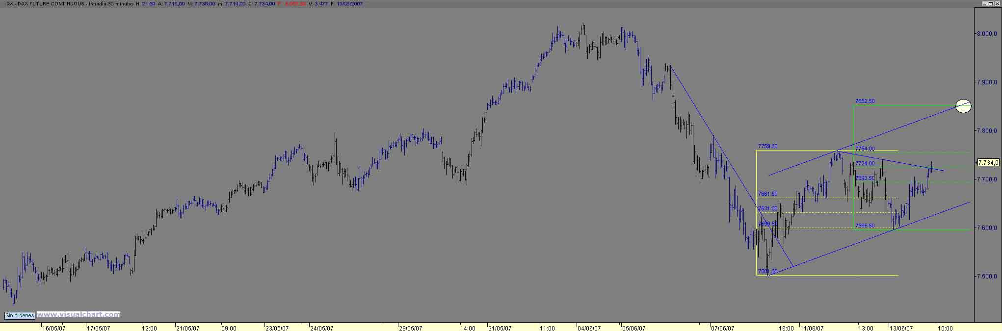 B noches lo primero que me sentire satisfecho si a alguien le aportado algun concepto que aunque simple sea efectivo que a la postre es lo que vale, teorizar vale para tomar el cafe charlando . Os comento el dia de hoy y algo que supongo que uno debe saber cuando cambiar la direccion del aire para que el flequillo no le venga a la cara, esta mañana ese primer impulso bajista del 7662.50 7596 con retro al 61 de Fibo 7637 hacia presagiar que de no superar ses 7637 la proyeccion le hacia ir al 7570 bien hasta aqui apostamos por ello y nuestro amigo nos da opcion de ponernos cortos en 7635 34 con stop 7638 (4 ptos) obj 7570 ( 65 ptos) hasta aqui si sale y apriori buen ratio y esa es nuestra apuesta logicamente si el precio va a nuestro favor deberemos proteger las posible ganancias sin dejar de mirar el obj inicial, simplemente esa direztriz desde el origen seria nuestro stop parcial en funcion del n de contratos con los que hayamos entrado (sobre eso hay varias posibilidades) si trabajamos con 1 solo el precio llega a hacer un minimo en 7603 es un casi triple suelo (mal asunto para los cortos y para mantener los beneficios) iremos acelerando la direztriz en la medida que la ganancia sea importante sin desdeñar la posibilidad de llegar al objetivo en este caso nos saca en 7615 y nos da la posibilidad cuando vuelve a la zona del 34 35 de volver a entrar aunque en esta ocasion nos salte el stop ( eso implica que ese impulso en la medida de haber violado ese pto nos desmonta esa operacion (con beneficios 16 ptos) si valoramos ese 7603.50 como triple suelo ahora cambiamos el chip y vemos que nos forma un primer impulso 7602.50 7648 (evidentemente dentro de ese grande hay tres pequeños (que tambien hay que gestionar ) que llega al obj de 3 7648 ese retro al 7621.50 nos da un pto de apoyo para buscar el obj de 2 que es el 7667 ( misma politica de proteccion de beneficios para impulsos grandes) en este caso vereis que a pesar de la noticia (que logicamente desbarata esto un poco) llegamos al obj del tercero grande 7694.50, por supuesto hay dias que se enrevesa y hay dias que solo tienes que ver como caen los puntos subiendo los stops de proteccion pero esta es la magia de operar que nunca sabes que deparara el dia confio que os haya sido util Saludos y gracias nos veremos seguro
