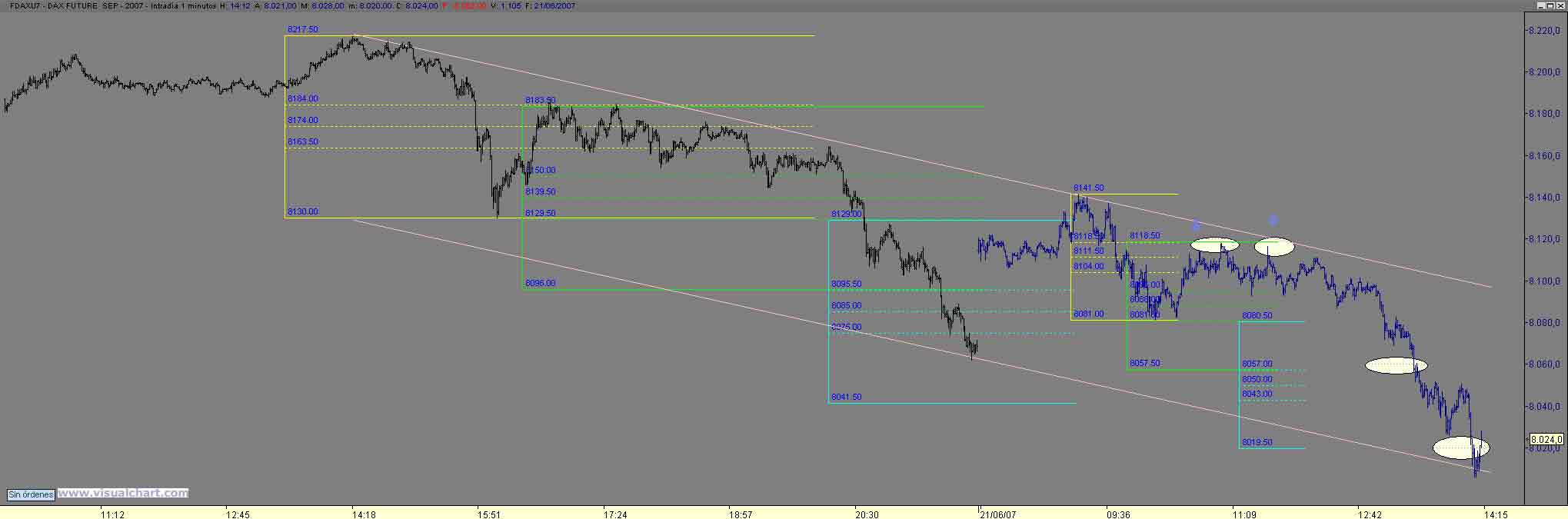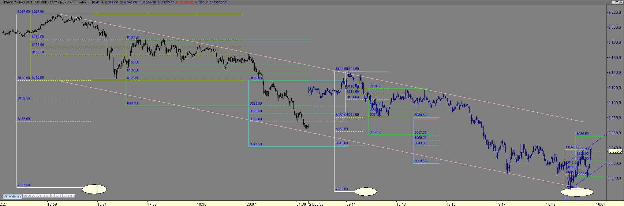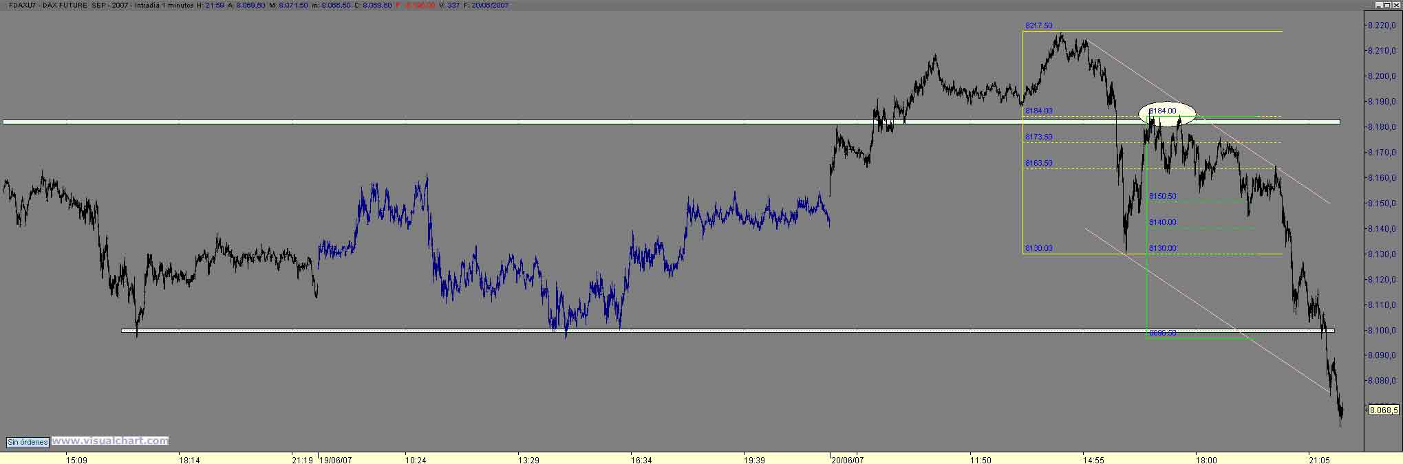 B dias teniendo un ratillo os ire pegando algunos movimientos de nuestro amigo el Dax desde su parada en el 7581 nos ha desarrollado tres impulsos mayores desde su primer movt en el retro al 61 de Fibo 7678.50 y de ahi del tiron al 8106 nos ha dejado dos claras zonas de control a nivel mayor ese 8100 8105 donde se apoya todo el movimiento de subida hasta hoy superado el 8180 sera el primer nivel a vigilar, en lo que respecta a hoy la apertura sobre los maximos de ayer ya invitaba a posiciones largas y mas cuando tras la apertura nos dejo un movt claro con retro al 61 de Fibo al 8163 cuyas proyecciones de 2 y 3 son 8191.50 y 8208 de ahi a testear el nivel 8189 90 clara zona que de no perderse invita nuevamente a largos Saludos
