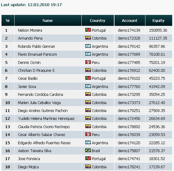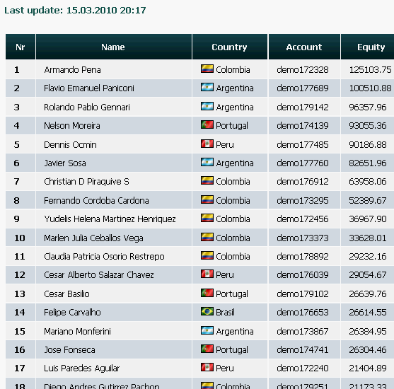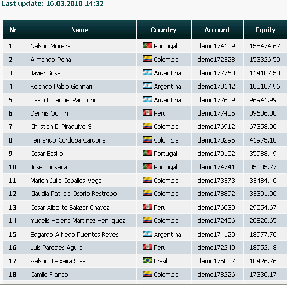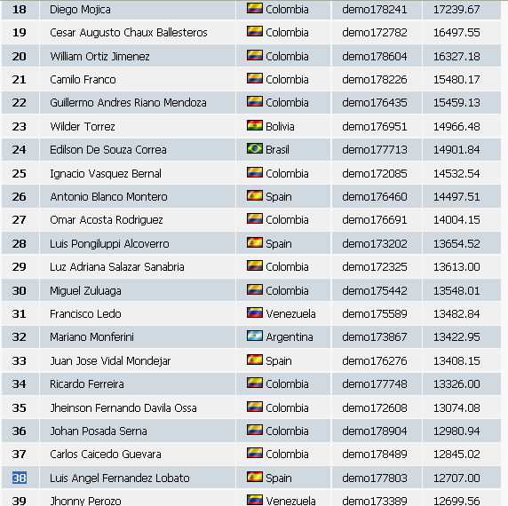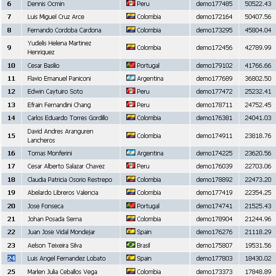 Llega la recta final, quedan 2 días y medio y el primero lleva 150.000$, el 10º 27.600$, vamos, que entrar en premios en esta edición está barato. Cualquiera que no haya operado todavía y empiece con 10.000$ el lunes podría llegar a pillar al 10º, parece increible, pero del concurso inglés al hispano va un abismo, en el inglés el 10º lleva 67.000$ y el 1º 192.000.