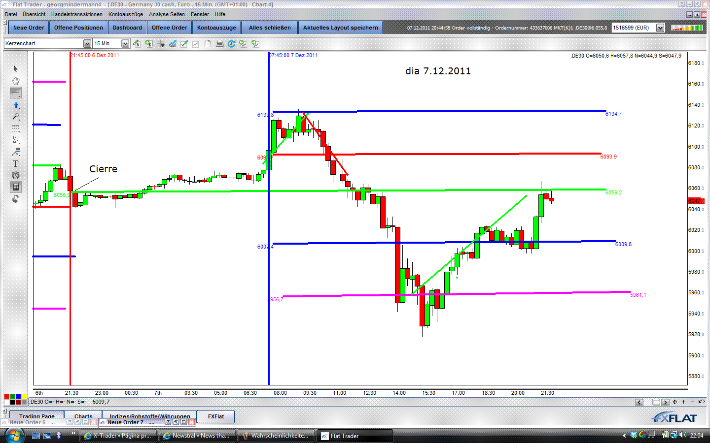 ) Aquí mando una imagen de la apertura de hoy aplicando las condiciones de george con cierre y apertura día posterior de FDAX y aplicando los márgenes en función de VDAX al cierre de ayer. Repito, es solo un esbozo de lo que he podido sacar del documento en alemán. Las zonas de color es el nivel de entrada para largos/cortos.