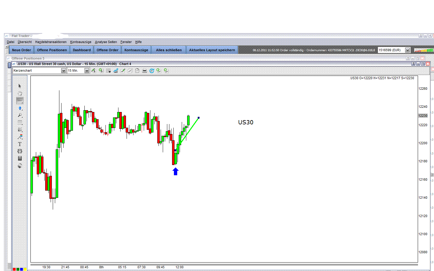 La entrada correcta hoy dia era en la primera zona larga a las 12:15h despues de la primera vela der Reversal de acuerdo con los DJIA FUT. Vease el grafico de US30 ( DJIA FUT adjunto ).Tengan en cuenta que negociamos CFDs .