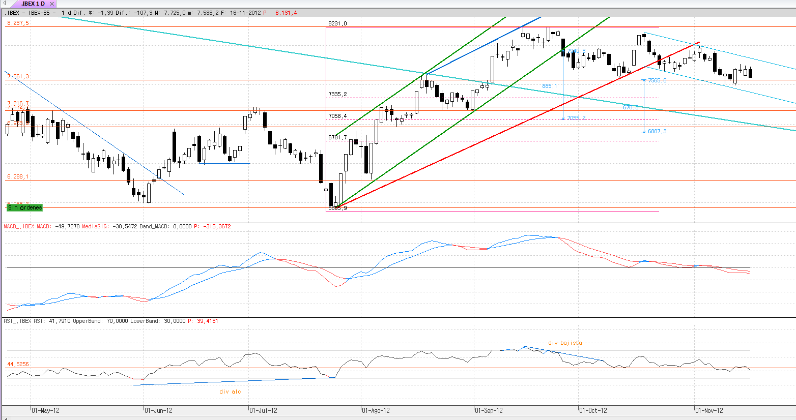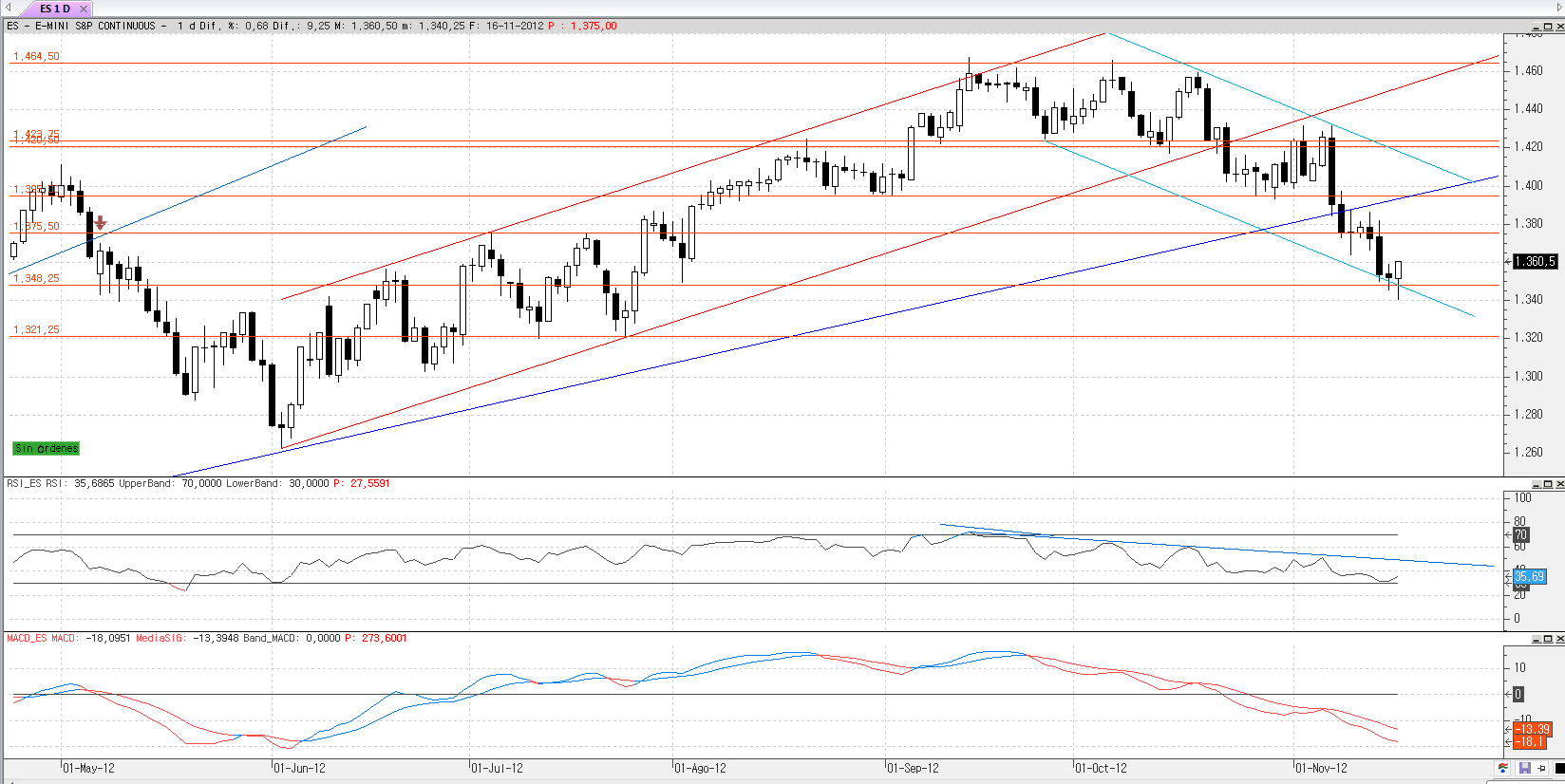 Buenos días, el escenario no ha cambiado, sigue igual, con tendencia bajista a corto plazo, ahora bien, si nos fijamos en el gráfico del sp500 vemos como rebota desde la zona cercana a la sobrecompra que coincide con la base del canal bajista y un soporte leve, pero pienso que es simplemente un rebote que le puede llevar a la zona 1375-1395. ¿Y este escenario como cuadra con el ibex y el dax? En cuanto al ibex podría rebotar hacia el techo del canal pero su estructura es más débil que la del sp500 y en cuanto al dax podría intentar cerrar el hueco dejado el día 15. Tras este rebote seguirán las caídas.