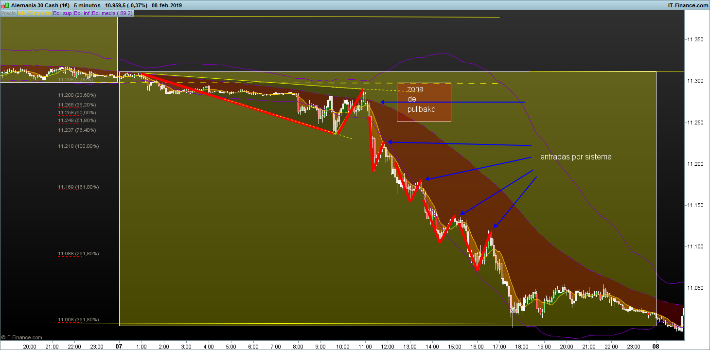 Cuando hay tendencia establecida, la zona que mejor ratios presenta en relación a RIESGO/BENEFICIO, son los retrocesos, los retrocesos forman un patrón en V con el ultimo segmento mas corto( en tendencia a cortos), es ahí donde este sistema marca entrar al mercado