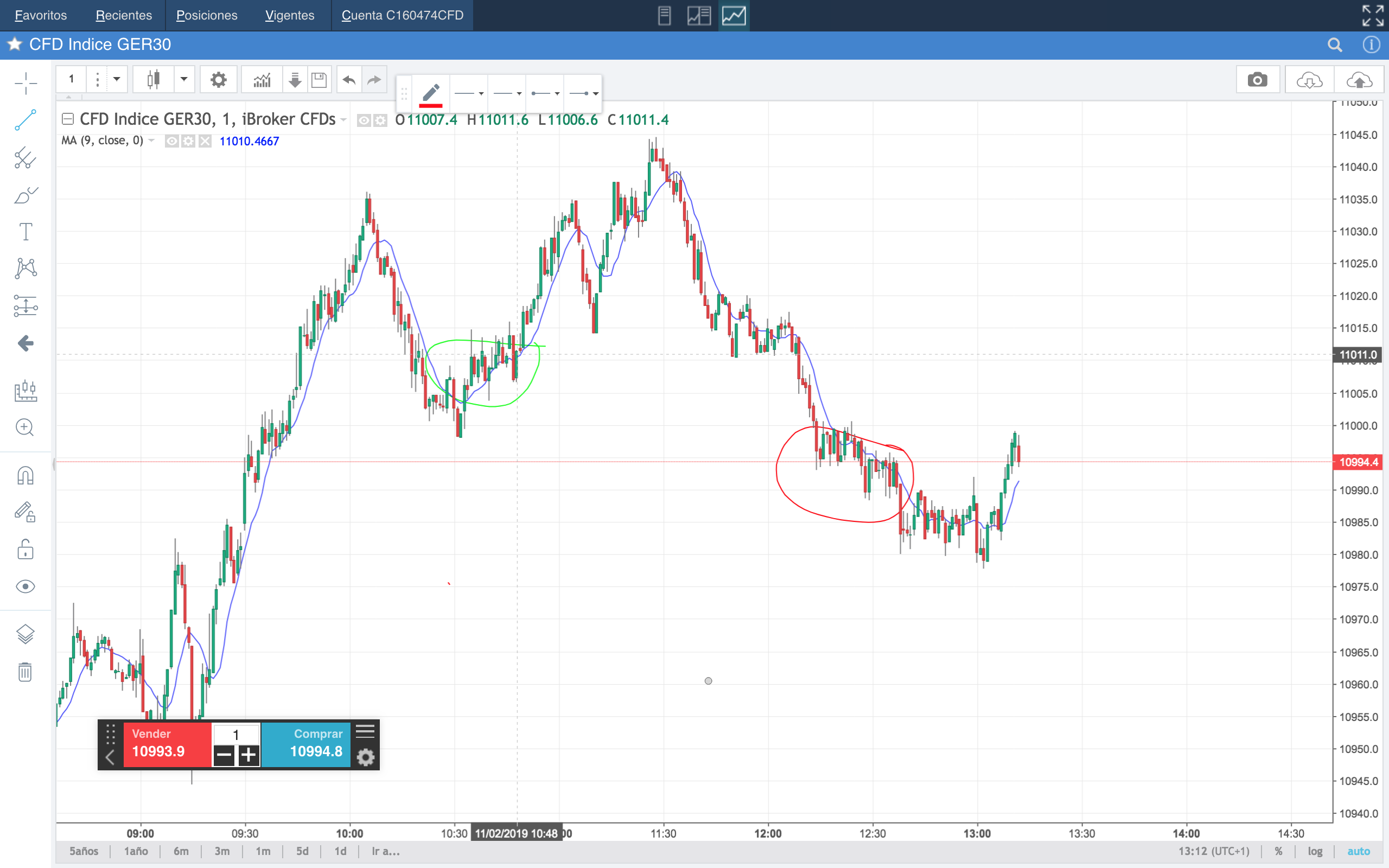 Con mucha practica, hay operaciones que cuesta varias entradas con perdidas muy pequeñas, pero si tira lo pillas, si te quedas mirando como se va porque te salto el stop de 10-15 puntos cuando el recorrido de ese índice pasa de 100 puntos muchos movimientos, pues no es así, si vas a pillar el movimiento ,en señales limpias muchas saldrá a la 1ª y en otras costara varias entradas, lo que no se puede hacer es quedarse mirando porque salto un stopt de migajas