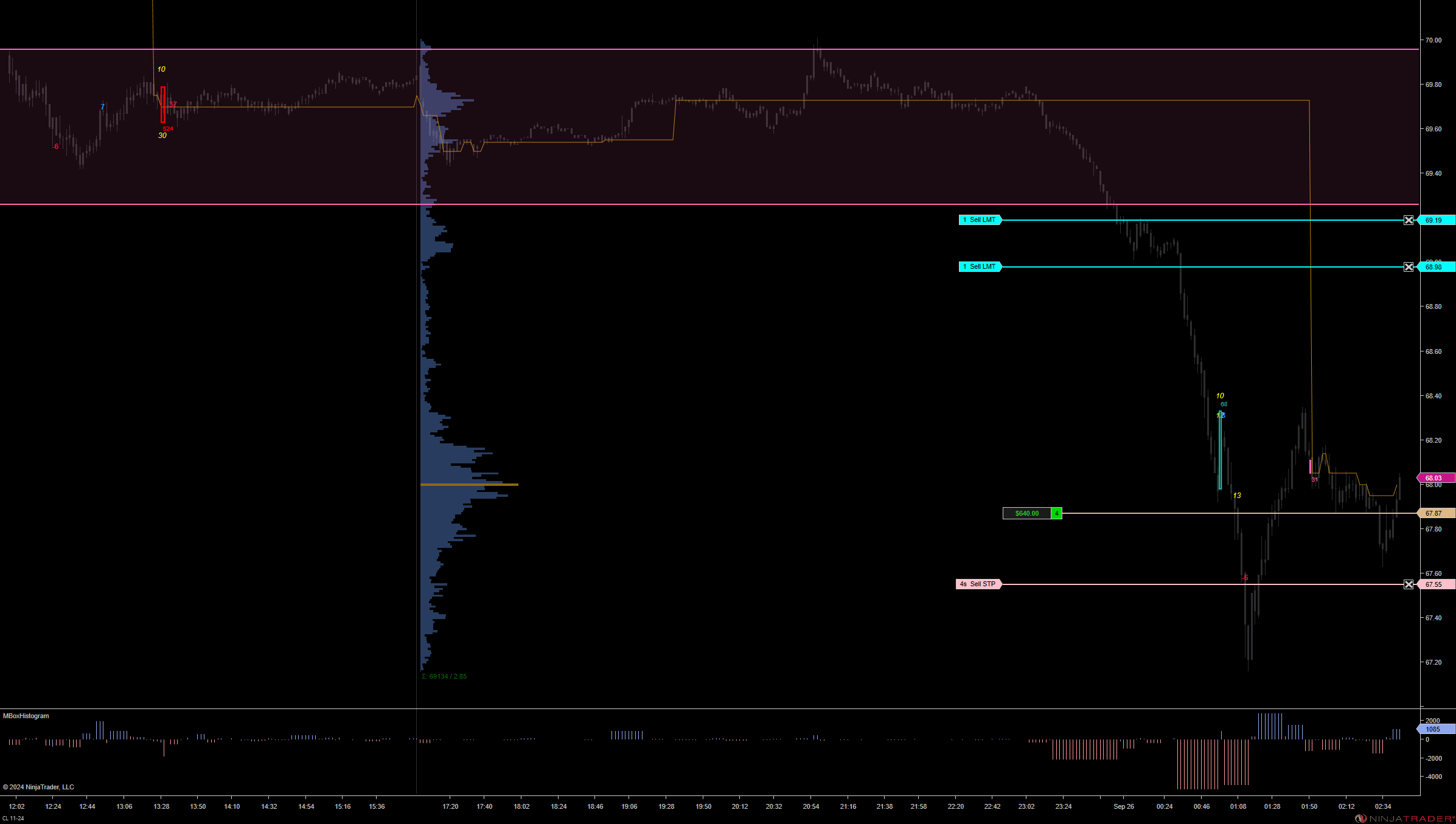 De 2 a 3 horas (CT). Los esfuerzos de los vendedores para hacer bajar el precio en la zona de 66,60-70. Sin resultado. El precio subió por encima del POC de hoy y del viernes. Para el premercado, prueba de la zona POC con predominio de la Demanda.