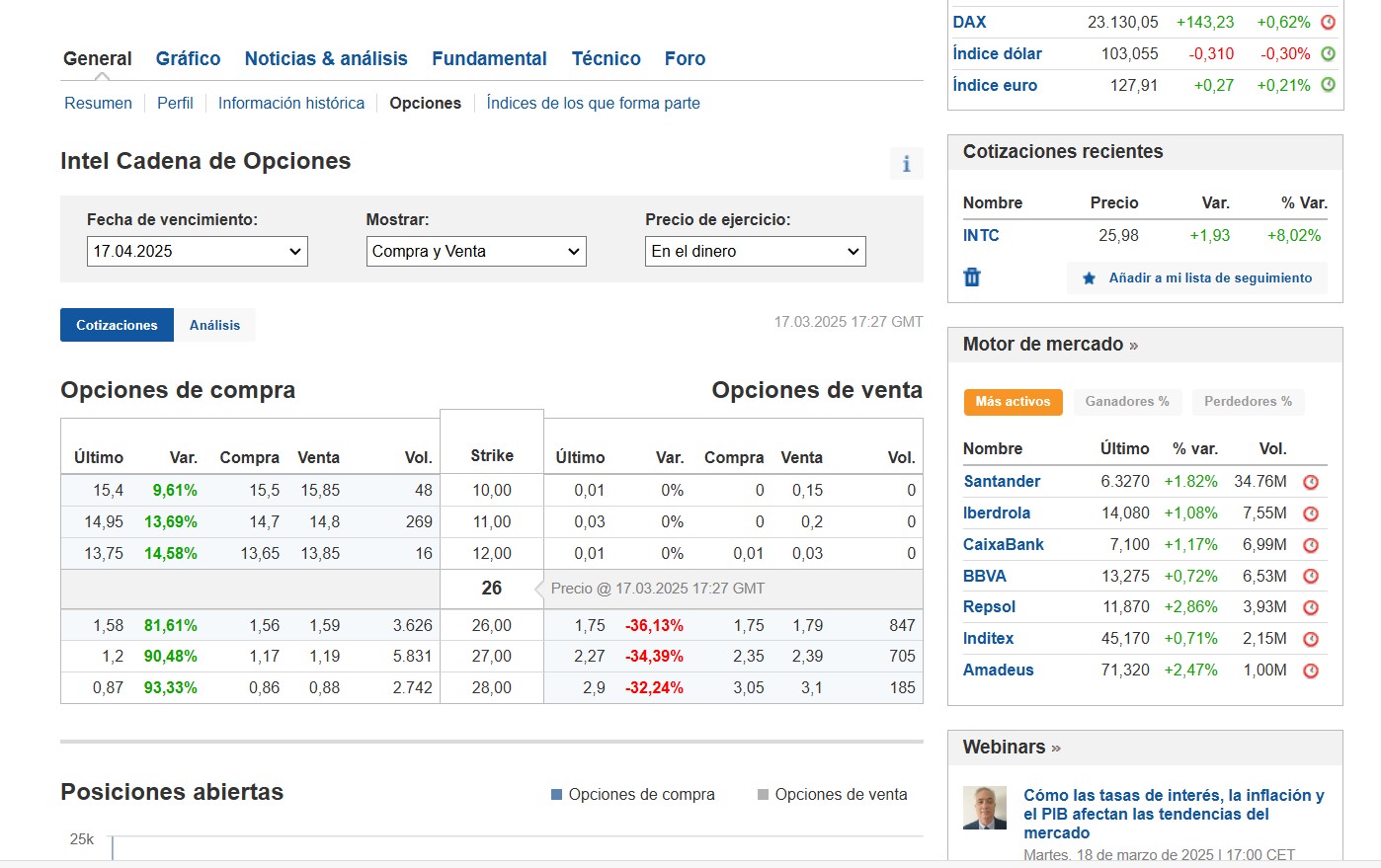 En las plataformas de opciones ya se muestra en la cadena de opciones y en las posiciones abiertas. Pero cuando quiero hacer una consulta rápida a veces voy a investing y en cada ticker hay una pestaña de opciones y cuando pinchas la opción a consultar la información es muy completa.