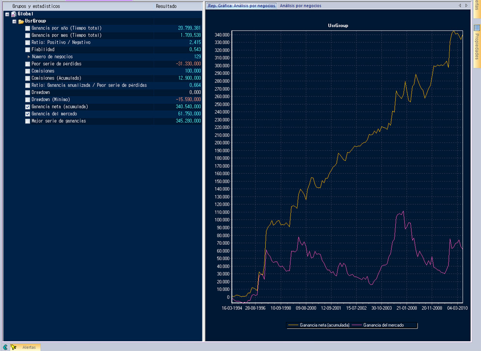 El gráfico que adjunto muestra las estadísticas del FIbex diario, En Visual 5 las estadísticas están bastante mejoradas, aunque tiene algunos fallos todavía de diseño y funcionalidad, el fallo más importante repercute en los sitemas, sucede que en VChart 4 los sistemas me daban unas estadísticas diferentes, siendo el mismo sistema, a como las da el VChart 5. Después de buscar donde estaba el problema, encontre que no era culpa del sistema sino de una función que siendo la misma no es igual que en VChart 4, al final la solución ha sido modificar los sistemas que utilizan dicha función, con lo cual tengo el mismo sistema con los mismos resultados de estadísticas en las dos versiones, pero con un codigo diferente de sistema. Esta vez no pienso decirles nada a los de Visual, que se caliente la cabeza como lo he tenido que hacer yo. Aún estoy esperando después de bastante tiempo que me respondan sobre algunas cuestiones que les hice.
