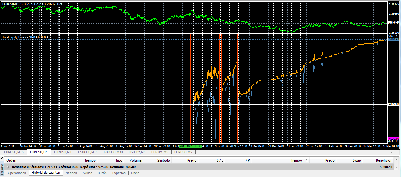Recordar que las verticales rojas del gráfico son retiradas de capital de la cuenta, en total 890 euros que se pueden ver en la parte inferior de la captura, así coo las ganancias totales acumuladas desde el inicio de la cuenta .