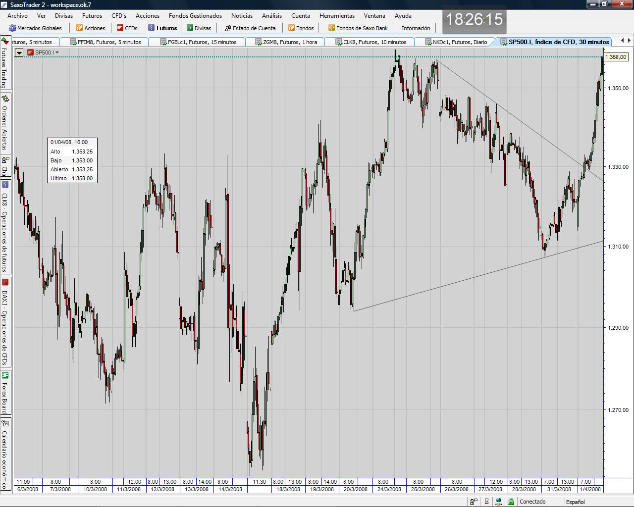 la próxima vela de 30 mins. en el SP500 puede ser determinante, se topa ahora con el 1.360, ke ya fué techito, de romperlo consistentemente su objetivo está en 1.410 por rotura del triángulo.