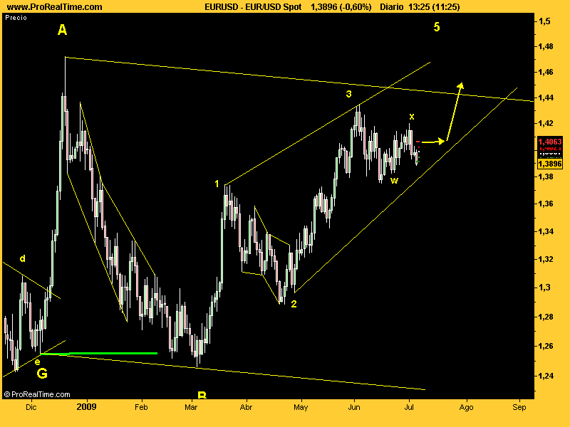 Holas Rubens, a mí no me salen esas cuentas de giro en el dólar todavía...me falta un impulsillo pequeñito hasta el 1.40 y pico...ahora un poco lateral haciendo el longuis unos días... :D Espero, vaya. Y cuando acabe este miniimpulsillo, se girará con ganas. Digamos que queda ese movimiento pa saltar stops de los nerviosillos que se han anticipao demasiao...Lo mismo me ekivoko,claro :lol: pero la pinta la tiene toda todita toda...si se va a girar con fuerza, primero tiene que amagar pa pillar a unos cuantos que cuando llegue el giro de verdad estarán desquiciados y recién despachados del mercado :-D