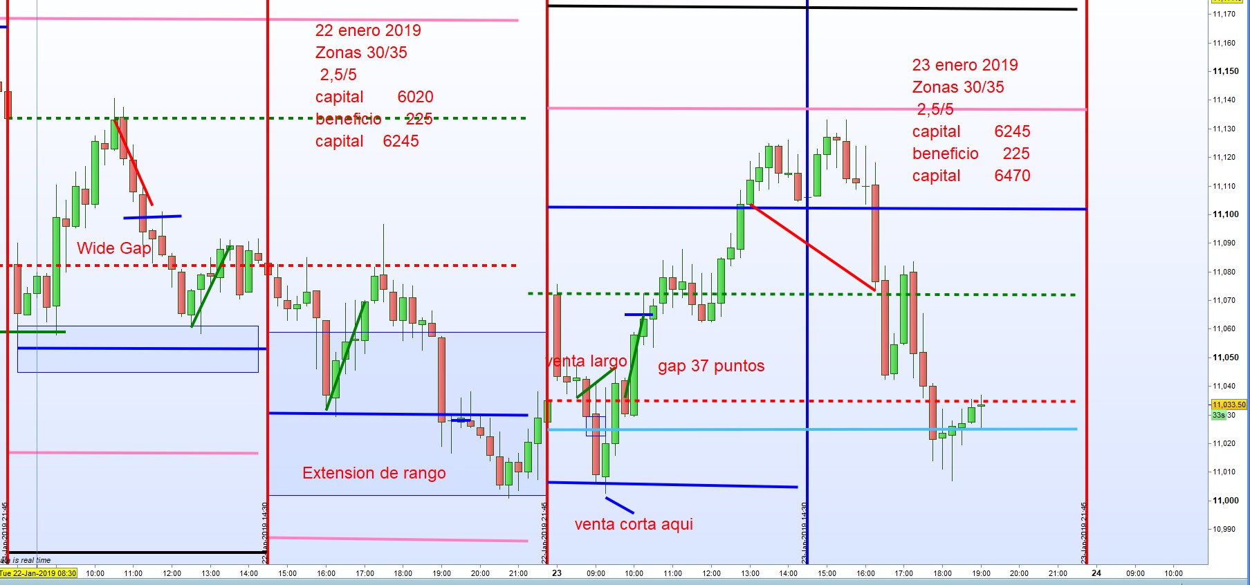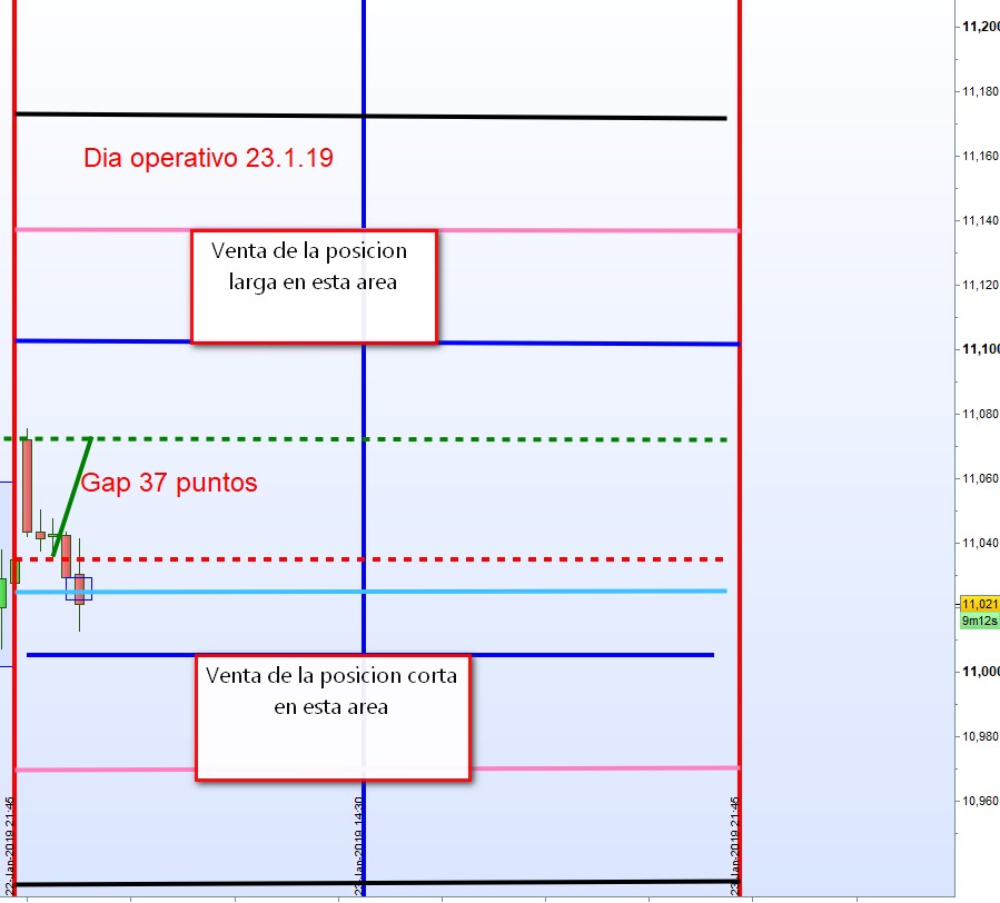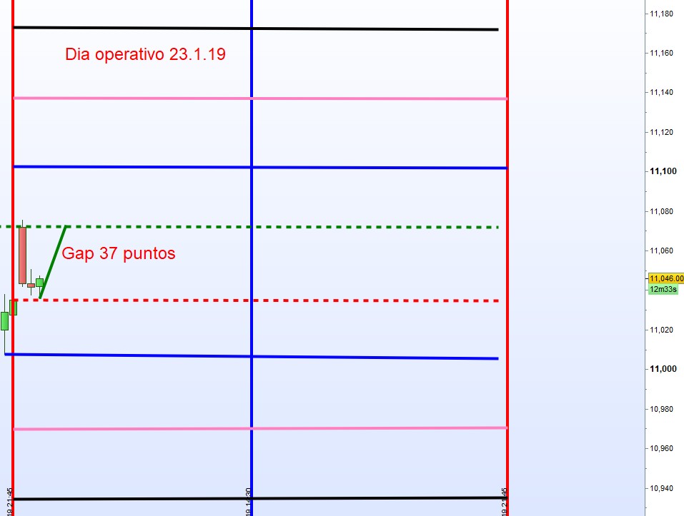 Adjunto marco operativo para hoy 23.1.19 zonas 30/35. El gap son 37 puntos y aunque no es exactamente un wide gap se puede tradear el gap con cautela. Por ejemplo con una contraposicion 10 puntos debajo. Suerte. Saludos GeorgM