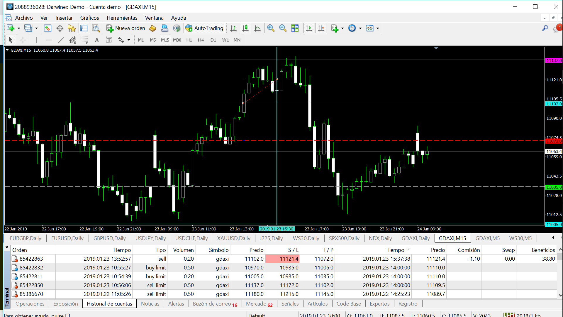Adjunto grafico del 22 y 23.1.19 con resultado de 450€ de beneficio. Al llegar a un capital de 7000€ aumentamos los contratos a 3 y 6 CFDs. Hay preguntas? Muchas vistas y poca participacion