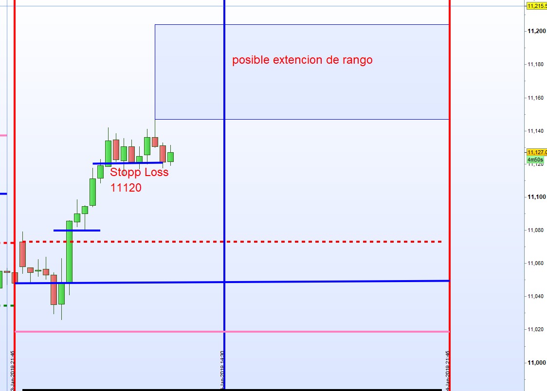 Nos queda un tercio de los contrados con 100 puntos de beneficio. Si el precio continua a subir despues de las 13:45h el stopp loss sera como dibujado. Si bajase antes podemos considerar el stopp loss anterior. Este es una apreciacion sobre la marcha. Hemos tenido ya un buen dia y hay que proteger los beneficios. A lo mejor habra una extension de rango.