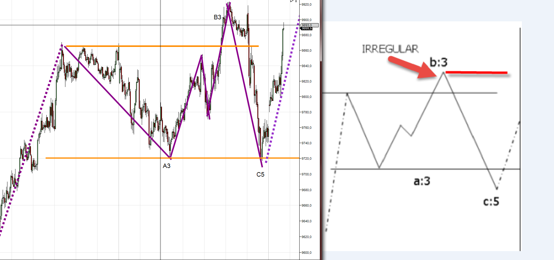 Sencillo ... una plana irregular son 3-3-5 ondas.el 5 en un contracto o en un impulsivo, si ves que ese C5 la onda 3 extiende 1.62 como mínimo respecto a la 1 y la 5 extiende minimo 1.62 respecto a la onda 3 ( ponte gráfico de 1 minuto de la caída de ayer )....