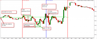 Por otra parte, y recordando que yo tb soy de EAs, aunque hago algo de discrecional, todavía mi mercado principal es el FDAX, pero como dice baltic46, me empiezo a cansar de algunas cosas. Una de ellas, que tengo pendiente intentar trabajar a nivel programación, es tener que considerar en realidad dos e incluso tres sesiones dentro de una, aunque no siempre, y ya estamos con los matices que complican tanto las cosas. Me refiero al DAX/FDAX hasta las 14'30, el de 14'30 a 18h, y el de 18h a cierre. Pueden ser caracterizaciones de sesión completamente distintas, y esto me ha dado muchos problemas, sobre todo en épocas de baja volatilidad.