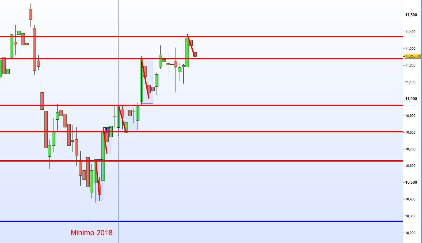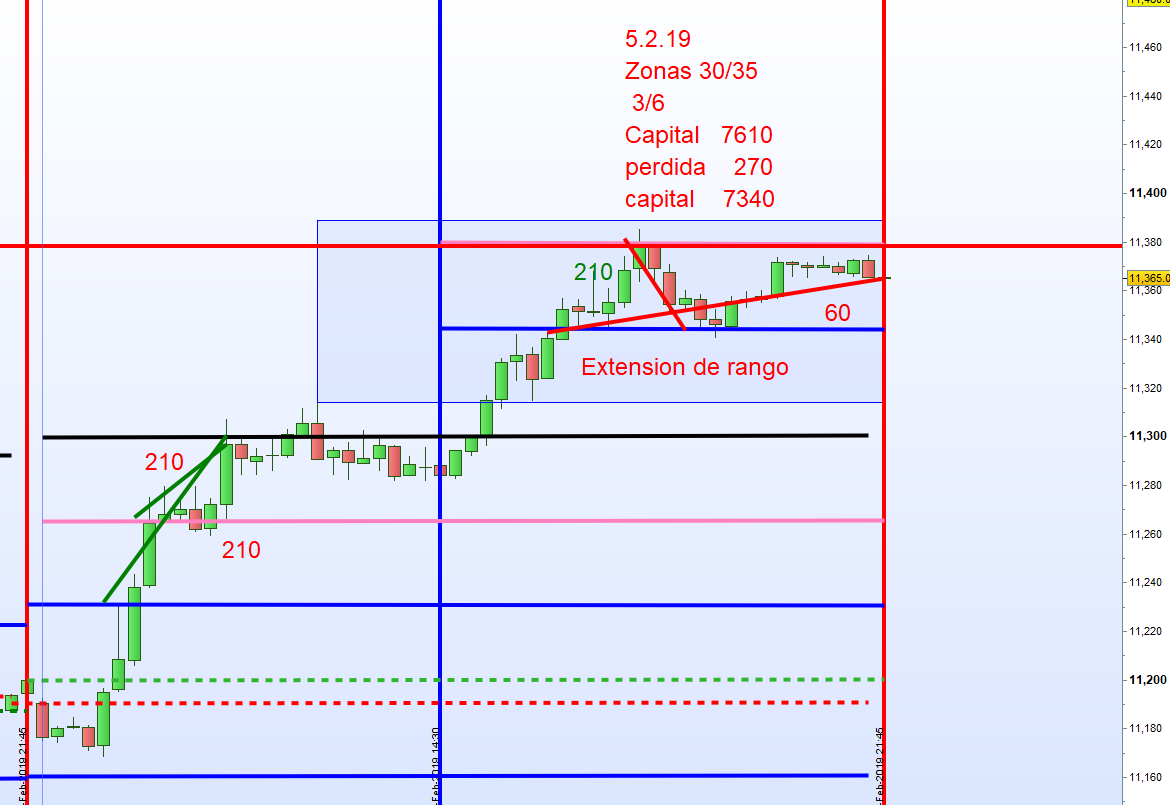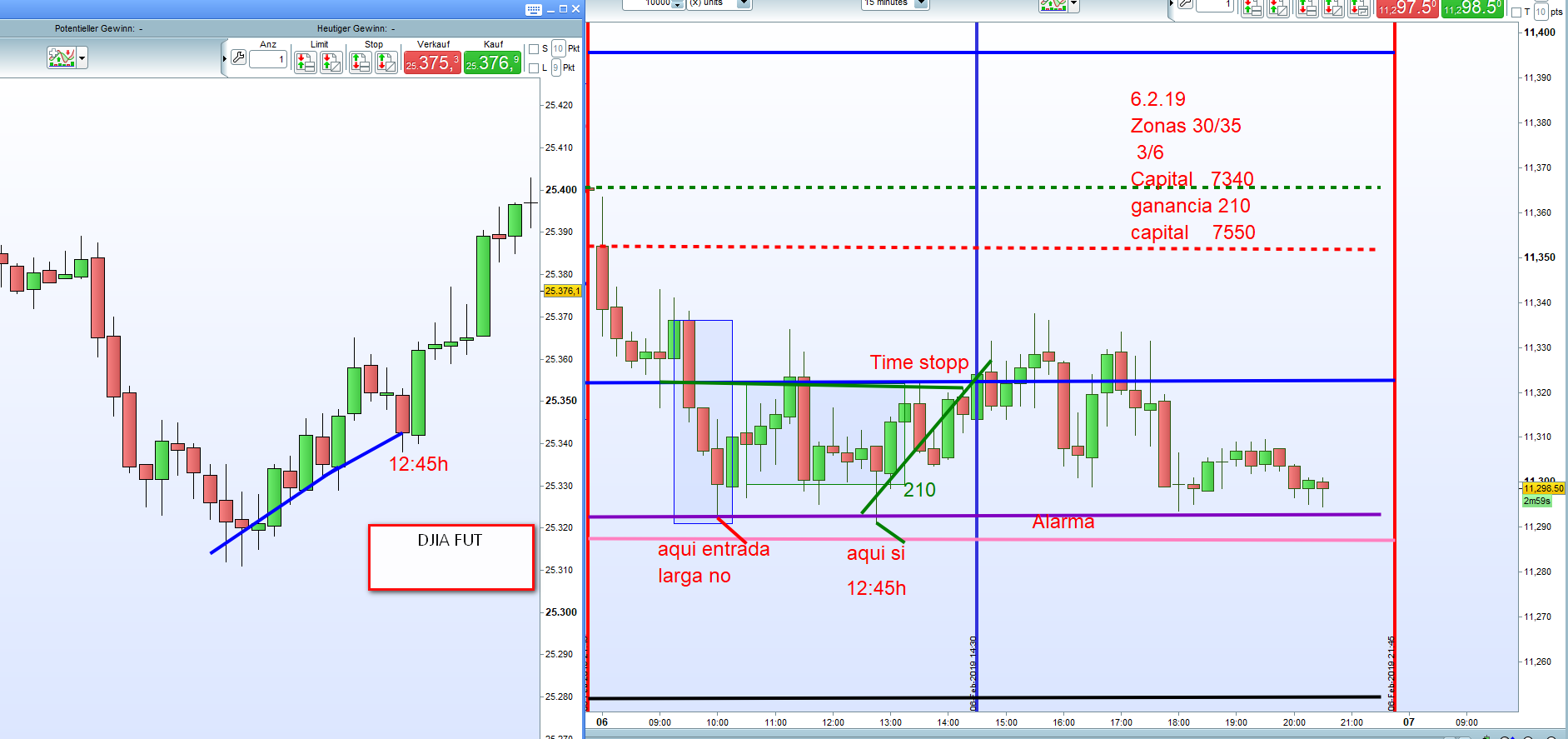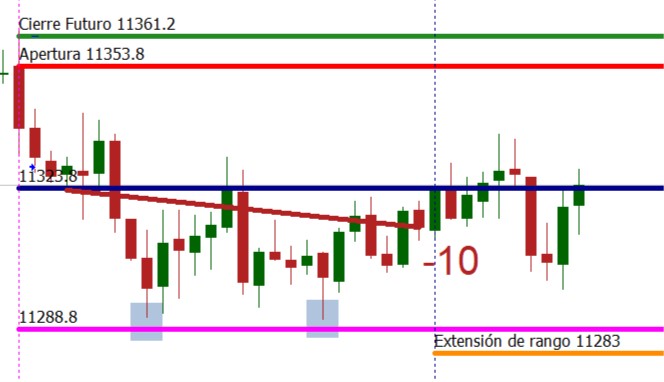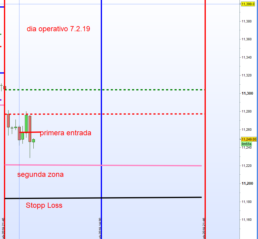 Despues la primera entrada con vela verde ajustamos el marco. Cuidado todos los Futuros cotizan con perdida. Importante la apertura del DAX a las 9:00h.