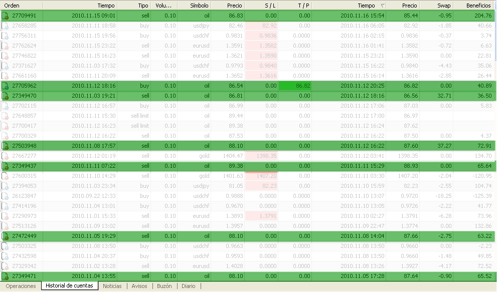 Cómo es un royo contar toda la gestión que he ido haciendo, dejo el libro de órdenes con las operaciones hasta ahora del crude oil 8, por si a alguno le pica la curiosidad (las verdes., hay un par de oil con pocos pipos junto a dos limit anuladas…se me fue el dedito al cancelar…no se vale