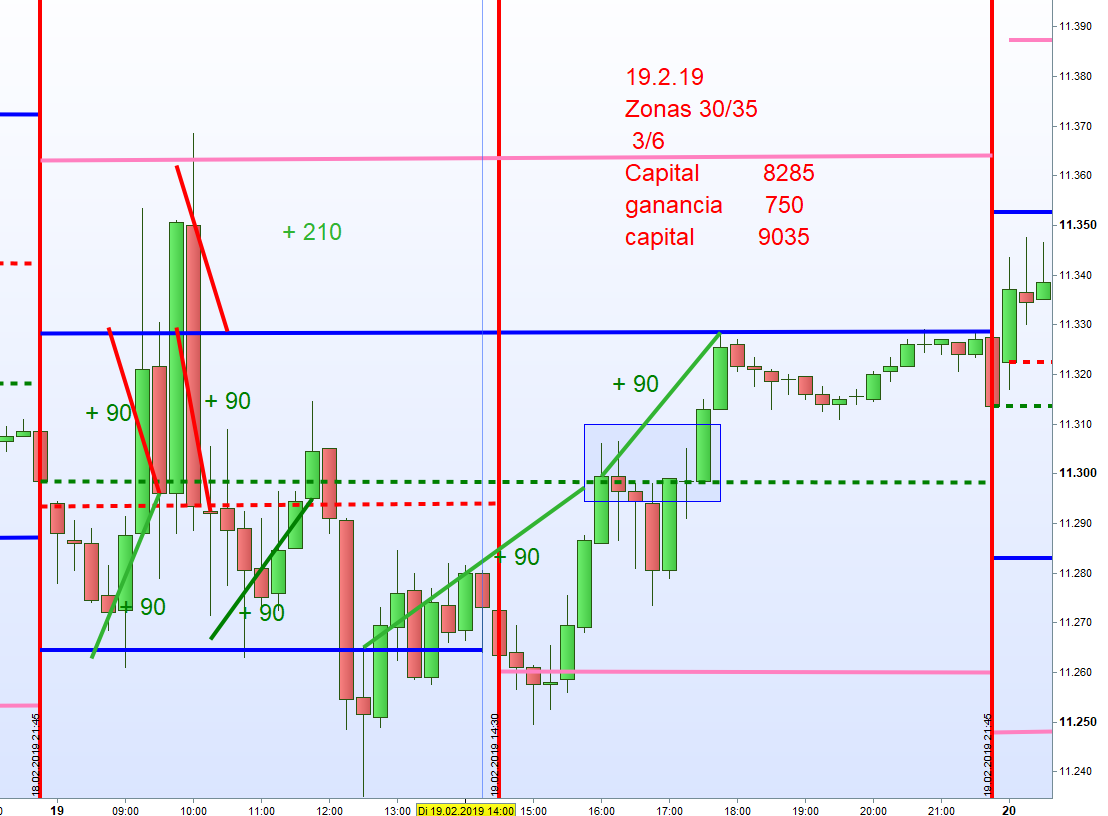 Resumen de la semana pasada. Con una ganancia de 1530€ ha sido la mejor semana de este ano. En los graficos aduntos observaran el dia 19.2.19 con una entrada por la tarde cruzando el precio el cierre del dia anterior. Este set up lo explicare manana.