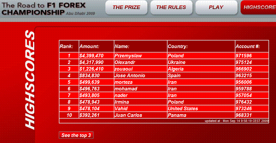 ... lo que pasa es que un autentico kamikaze, que se apalanque a muerte, tanto que con dinero real sería inviable, por puro azar alguno acierta, desvirtuando la calidad de los trader, entonces se convierte en un concurso de suerte y no de habilidad... un concurso en el que se valora las estabilidad más que el resultado final, creo que es más justo...