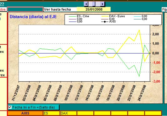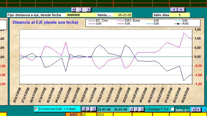Cogeríamos por ejemplo al Mini SP vs Dax y meteríamos en una tabla un histórico solo con fechas y cierres diarios para cada uno, un inciso, Lo que quiero sacar no es el spread que exista entre ellos en un período historico, sino el alejamiento y cruce entre ellos por cada día y sin acumular.