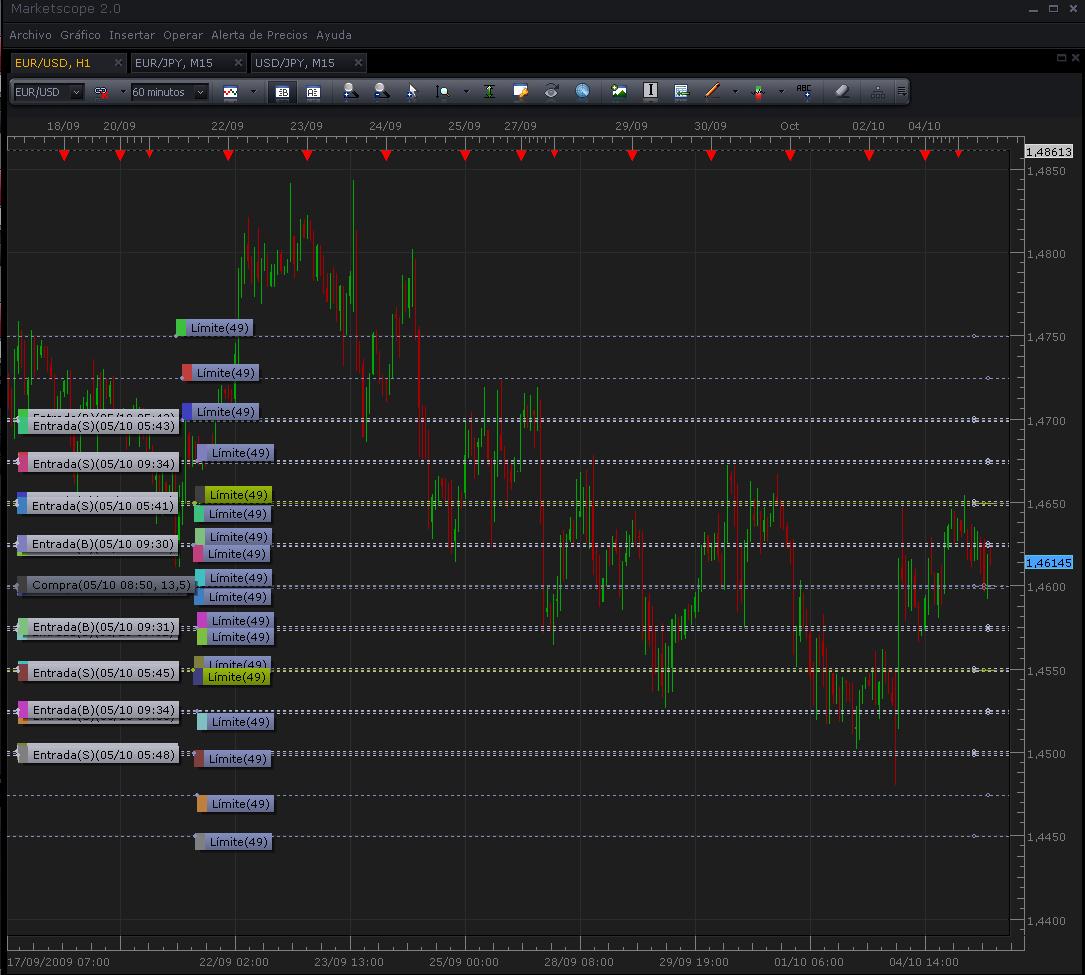 Los limites los tengo (ire cambiandolos a lo largo de la semana) entre 1,44 y 1,48, mientras no se me acerque o se pase de estos limites yo ire sumando pipos de ganancia (mientras pase mas de 2,5 veces por cada sitio en promedio)...