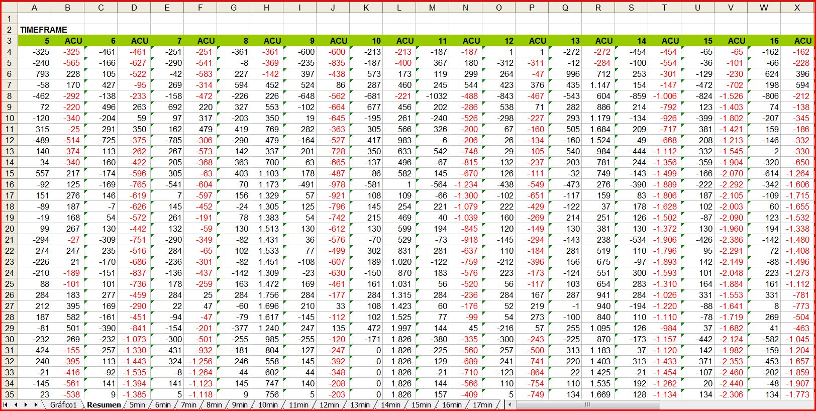 El problema es que había demasiados periodos para optimizar y corroborar mi estrategia de optimización, además me di cuenta de que solo estaba utilizando un marco temporal, por lo que el trabajo para probar otros marcos temporales y varios mercados y verificar cual iría mejor se convertía en una empresa que me iba a llevar tiempo, quizás meses o años. Decidí entonces crear mi propia herramienta de optimización para agilizar el proceso (todavía no sabía que existía MSA de adaptrade). Dicho y hecho, en una semana tenía una herramienta (construida en C) que me permitía realizar la minería de datos que necesitaba rebajando el tiempo de proceso de cada tramo de 3 meses a unos pocos segundos (adjunto pantallazo de los resultados), con lo cual podría analizar varios años de data en diferentes timeframes sin necesidad de pasarme años delante del ordenador y comprobar donde podría funcionar mejor mi estrategia.