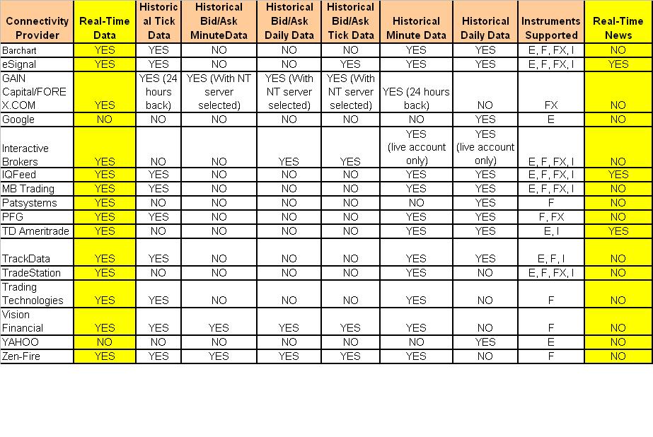 2) NT no tiene nada que ver con los datos, solo los gestiona para poder graficar. Los "data feeds" pueden ser muy diversos y de diversos precios. Desde los que te da el broker (IB da gratis el mercado americano y forex, Mirus te facilita datos a traves de Zen-Fire , tambien gratis), hasta los que quieras contratar de forma independiente.