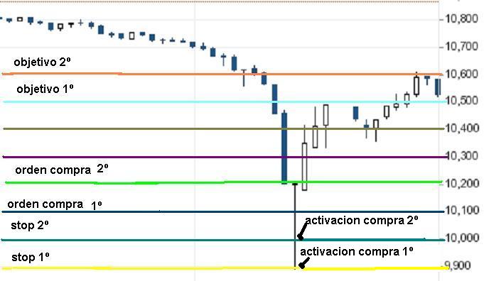 Pongo un ejemplo, de como se tendría que operar bajo mi juicio una situación asi, para empezar sería ver que tendencia hay en el activo, en este caso a mi me da tendencia bajista del DOW JONES, desde el 28 de abril, por lo tanto la vuelta en V sería contra tendencia, con lo que el ratio riesgo/retorno que aplicamos es intradía y 1:2.