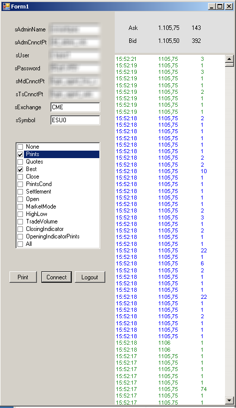 La GUI no es más que un Form windows con un panel a la derecha para escribir la información de los prints y arriba los datos de la horquilla. A la izquierda del formulario están los campos para entrar los datos de conexión y abajo un grupo de checkboxes para seleccionar la información que se quiere recibir de Rithmic.