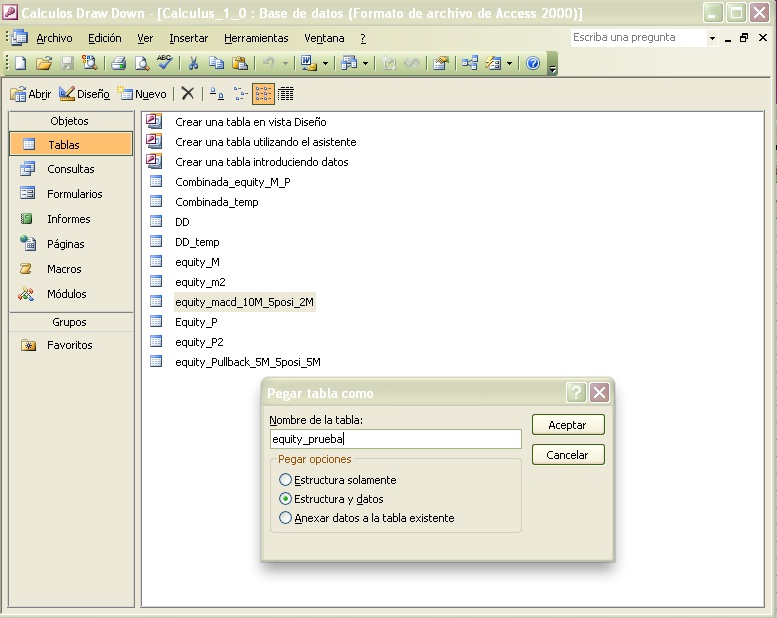 Al pegarla, Access nos deja darle otro nombre, y dejarla en blanco ("estructura solamente"). En el ejemplo de la imagen, se esta creando la tabla "equity_prueba"