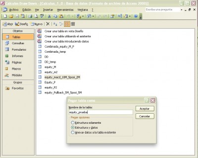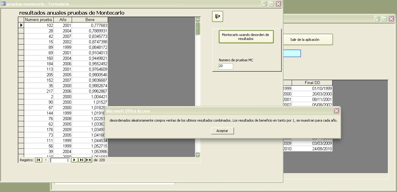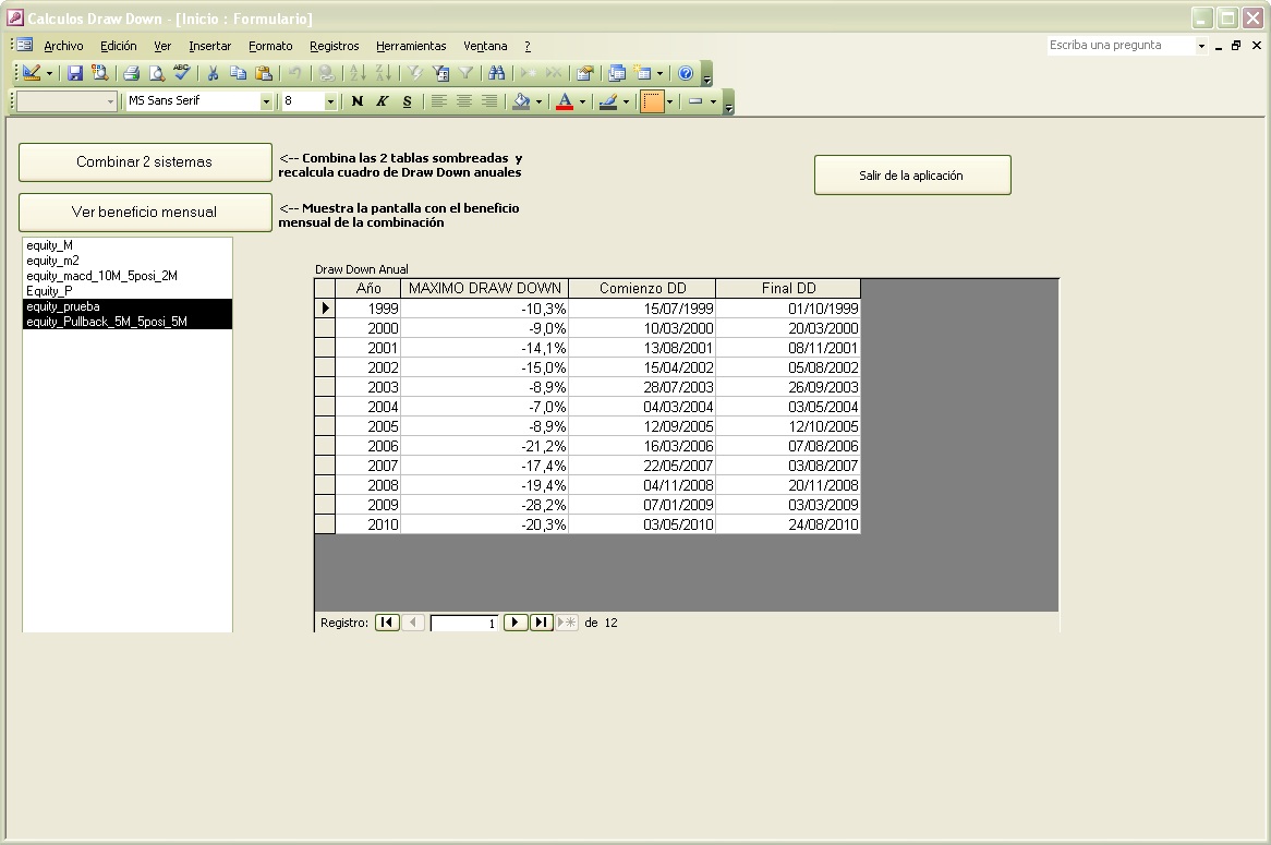 Asi que he hecho una pequeña utilidad en Access que permite combinar hasta 2 curvas de resultados, mostrando luego los Draw Down anuales (que es cómo suelo verlos yo), y resultados mensuales.