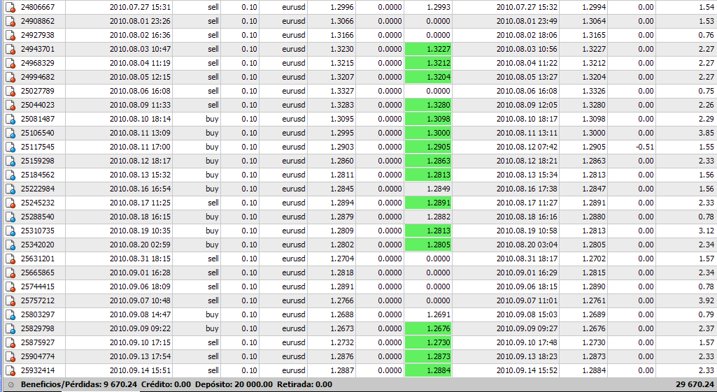 Mira cu6yu4, te pongo las 27 últimas operaciones de una cuenta demo que estoy manteniendo viva hasta que retome la estrategia principal, para que no me la cierre el broker. Para mantenerla activa utilizo la estrategia "escopeta de feria", sin indicadores de ningún tipo.