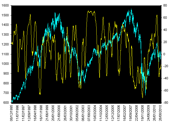 Luego hago el gráfico de líneas en 2 ejes. En uno (izq) el sp500 y a la dcha este indicador.