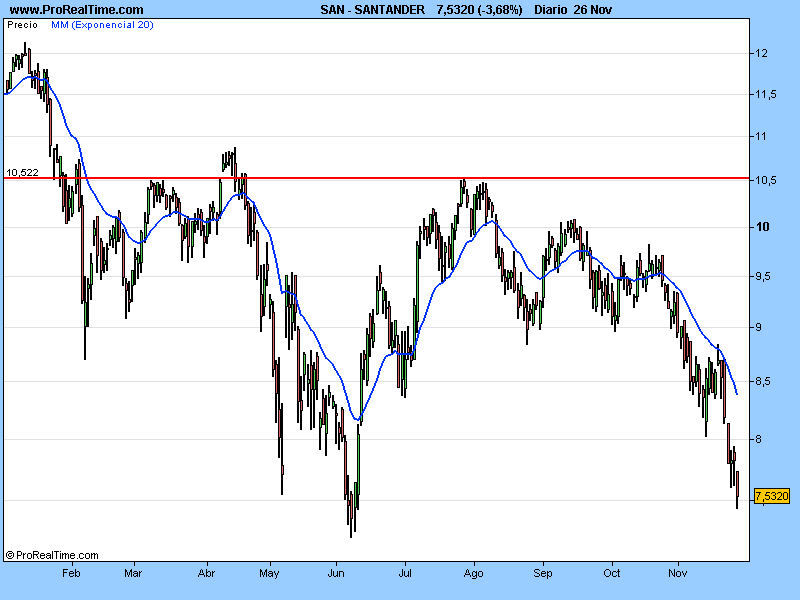 Te pongo el gráfico de Santander sin y con ajuste de dividendos para que lo veas claro,ambos son de la misma plataforma,ProRealTime