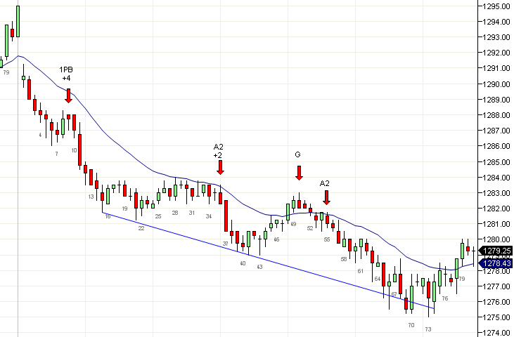 Hubo 2 grandes velas hacia abajo seguidas por una entrada en corto con A2 (retracción de dos segmentos a la EMA) y debido al tamaño de la vela 45 había posible presencia de compradores debajo de ella, por lo que una salida en el mínimo de la vela 45 era probablemente justificada.