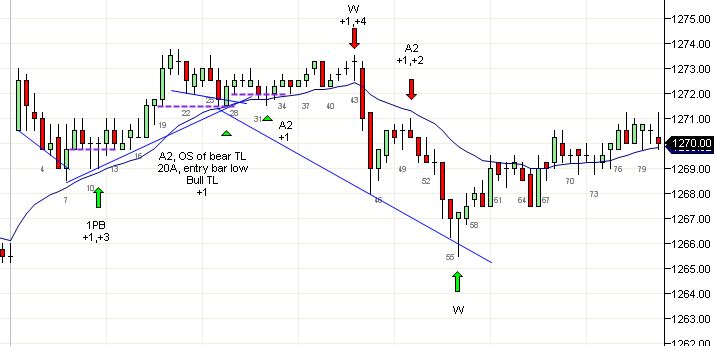 Hoy hubo un rompimiento tardío de la tendencia alcista que se dio después de 4 intentos fallidos. La L4 debajo de la vela 42 fue una típica trampa doble. La vela 43 rompió por un tick el mínimo de la vela 42 atrapando a los bajistas, después rompió por encima sacando a los bajistas y atrapando alcistas, para luego romper por debajo convirtiendo a la vela 43 en una W (cuña), una W1P ( ), un DT (doble tope) y una DP (retracción de doble tope).