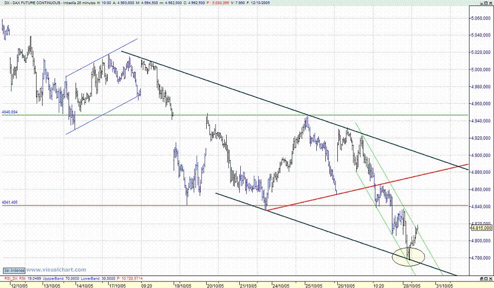 La ruptura del triángulo del Dax, buscando su objetivo mediante una canalización bajista acelerada.
