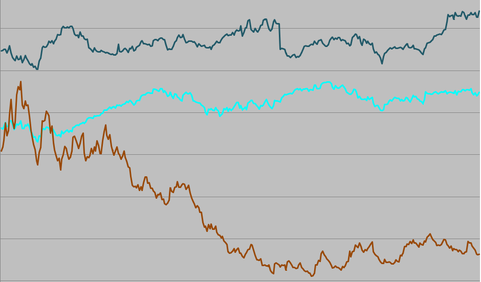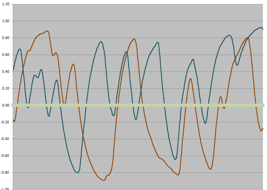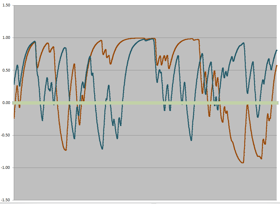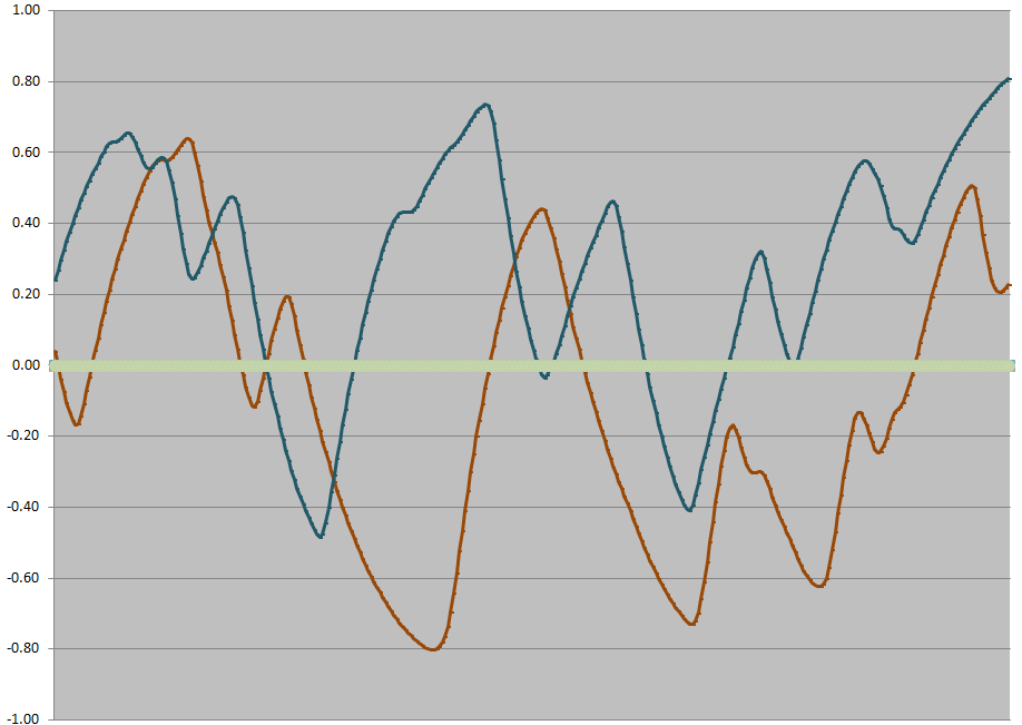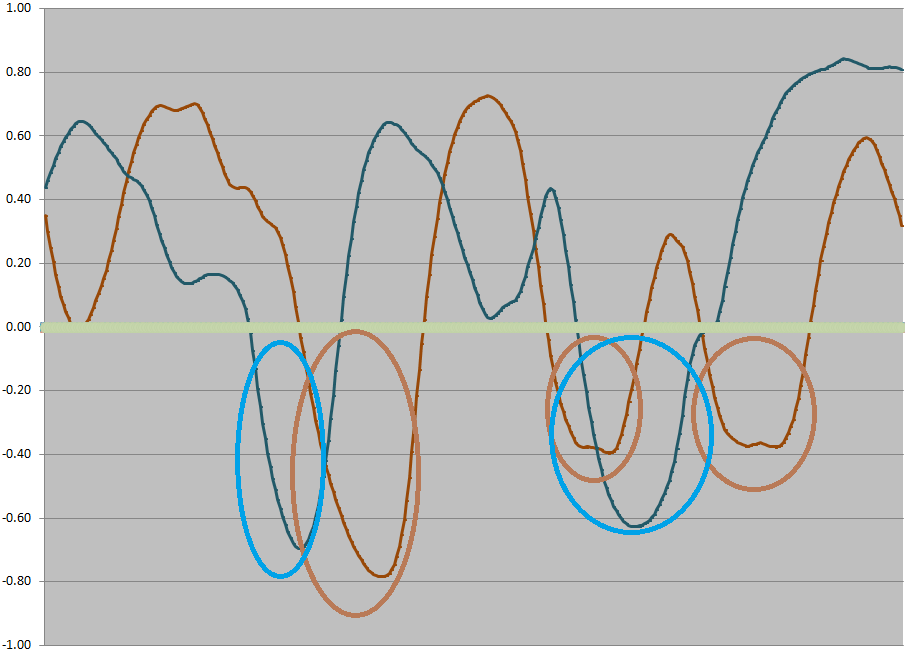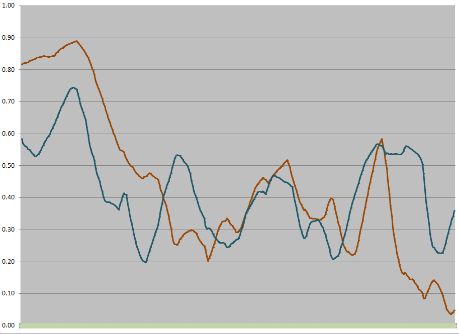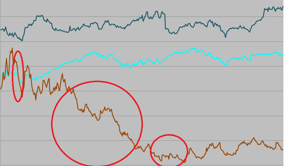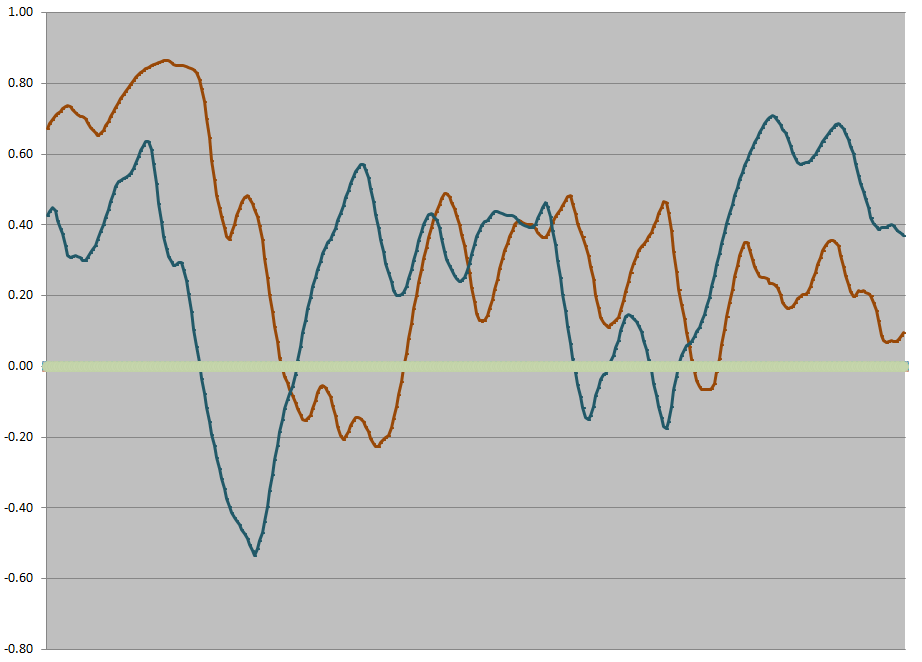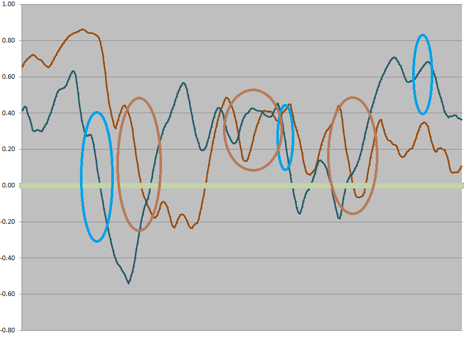 Después de varias horas...escogemos unos parametros que nos den una información clara de lo que estamos buscando. Obeservamos que el activo azul guarda una correlacion alta con el benchmark por contra el activo marrón guarda una correlación negativa respecto al benchmark. Y podemos gestionar una información valiosa a la hora de tomar deciones, por ejemplo activos con una correlación por debajo -0,20 vender (siempre que tu sistema te lo indique, estamos sólo haciendo zonas de correlación no un sistema propiamente dicho) en relación con el benchmark, gráficio ejemplo;