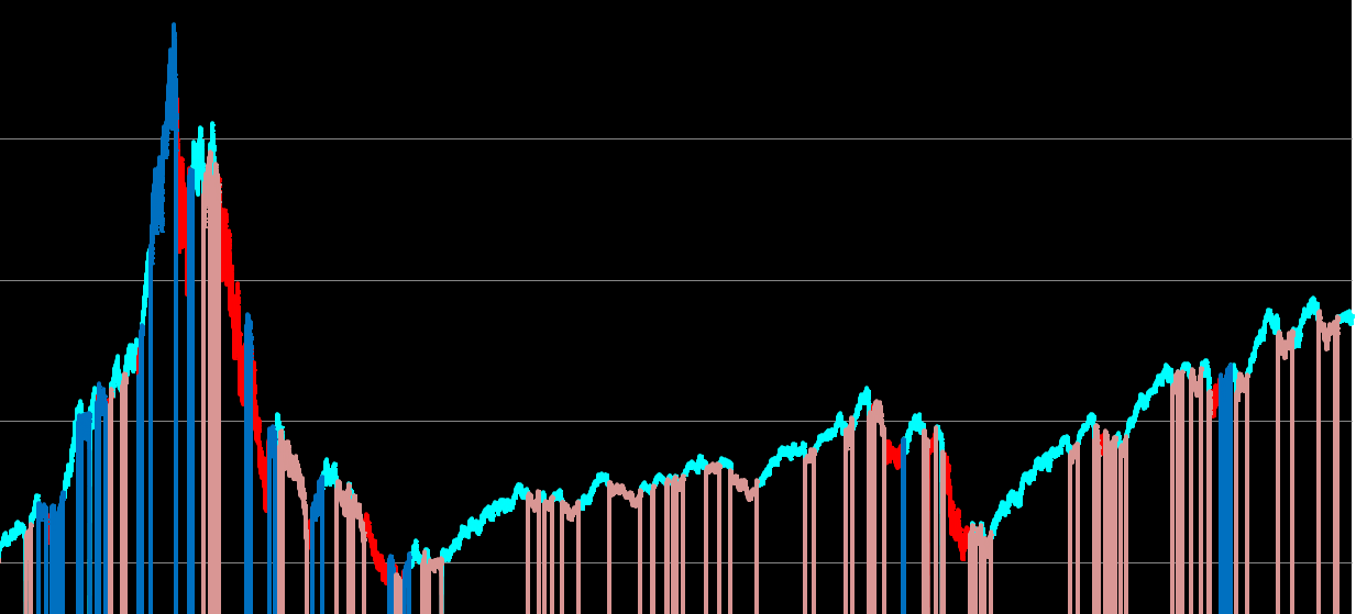 1º La zona azul clarito muestra que el benchmakr esta en tendencia alcista y eficiente