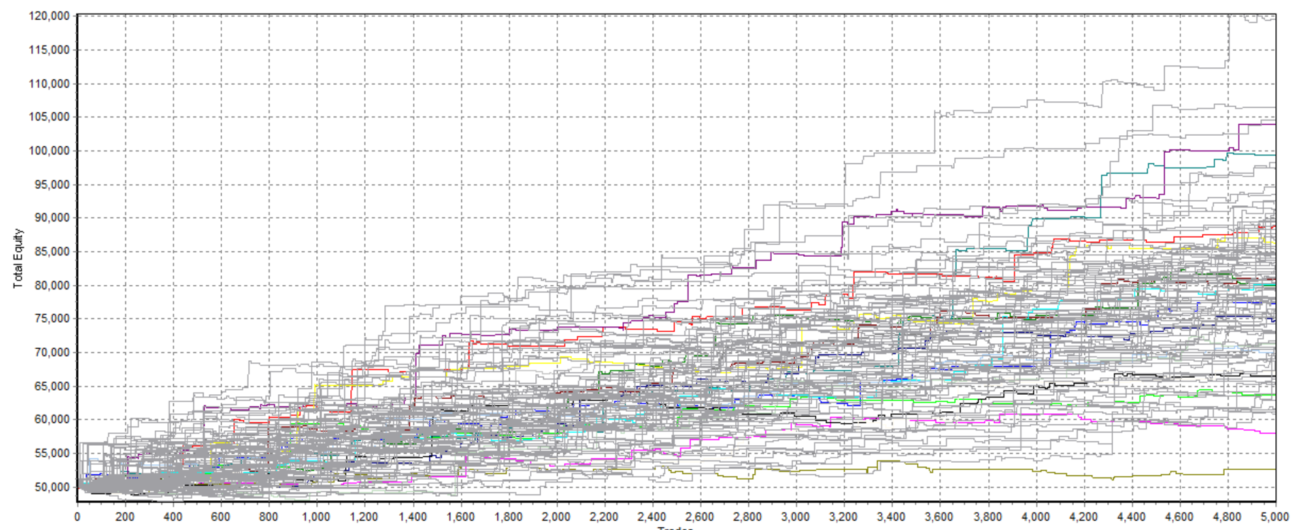 Mirar que las diferentes curvas con Montecarlo también puede ser útil pero creo que es más indicativo que los dd sean estables. Al fin y al cabo si el dd máx no se va mucho del original indica que la curva de equity es parecida ya que el beneficio obtenido siempre va a ser el mismo (siempre que no apliques money management, claro).