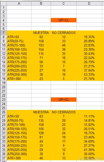 Se define ATR como el valor máximo de (High-Low) (High-Close) (High-Open) (Close-Low) (Open-Low) así mismo se diferencian los casos, cuando el Open es mayor que el Close o el inverso: