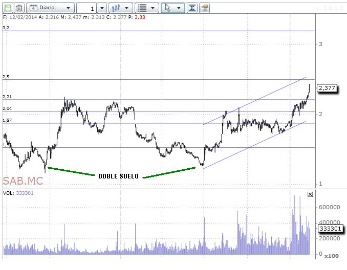 Sabadell. Ese doble suelo se ve muy bien en gráfico semanal, pero como te interesa corto plazo, lo muestro en diario. El valor está bien canalizado y se acerca a la zona de confluencias entorno al 2.5. ¡Ojo ahí!. Si lo rebasa, lo testea y no lo pierde, buen objetivo el 3.2.