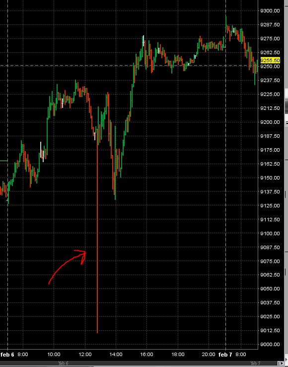No tenia nada abierto, pero ver como ha bajado 170p en 3 segundos..he flipado! Luego además en subasta durante 3 minutos como si fuera un chicharro del continuo, eso si los brokers de cfds se han parado y no se si en ellos la crujida de stops habrá sido asi, pero no lo han recogido los graficos...por primera vez he visto mas fiable los cfds que el FDAX