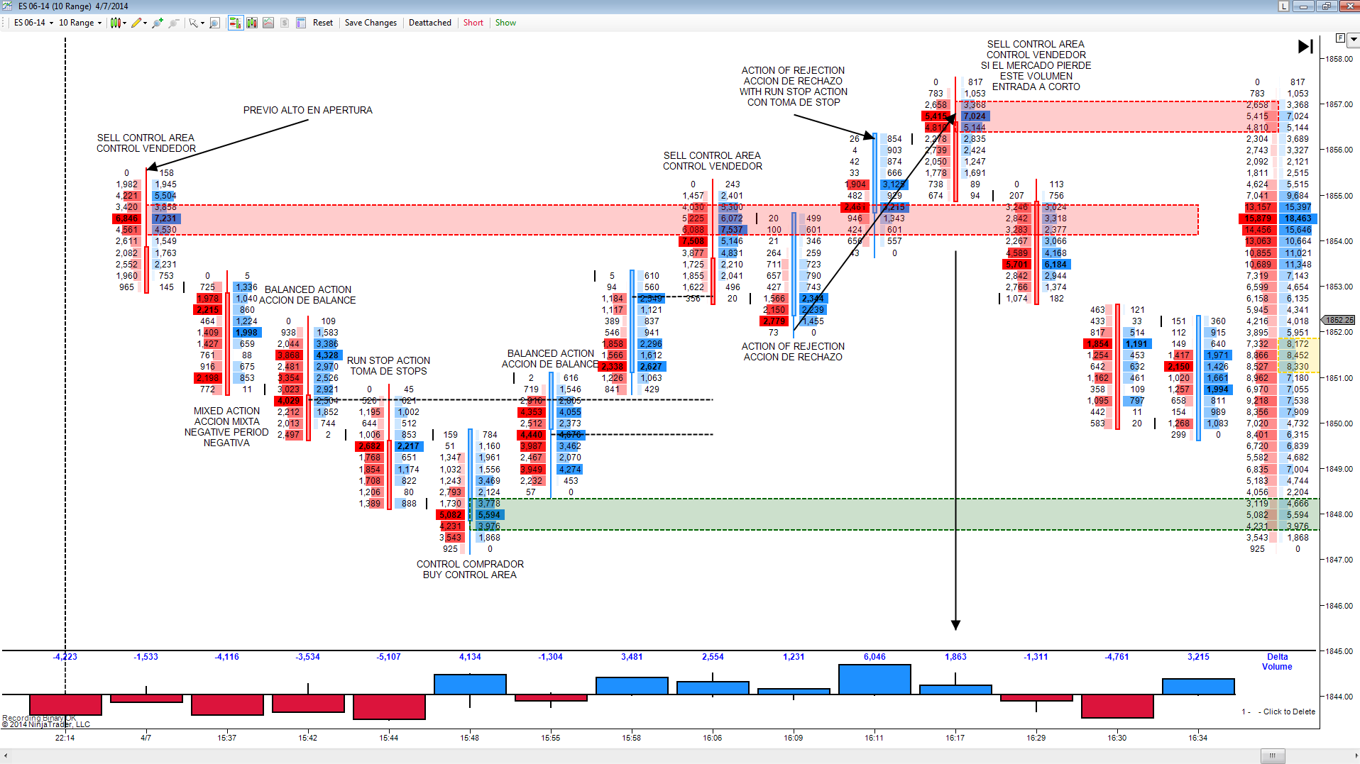 Me alegro de que por fin se hable un poco de order flow en este foro. Yo llevo utilizando estos gráficos desde hace unos 4 años y el tema es tal y como la plantea Daytraderprofesional (dtp, a partir de ahora); Es decir, nos permite mirar el interior de las velas, como si de una radiografía se tratara, para observar cómo se ha desarrollado la subasta siempre en los punto clave de soportes y resistencias, áreas de valor, concentración de volumen, etc... Pero no es fácil llegar a inferir los patrones... no sólo porque haya mucha venta el precio va a bajar y al contrario.