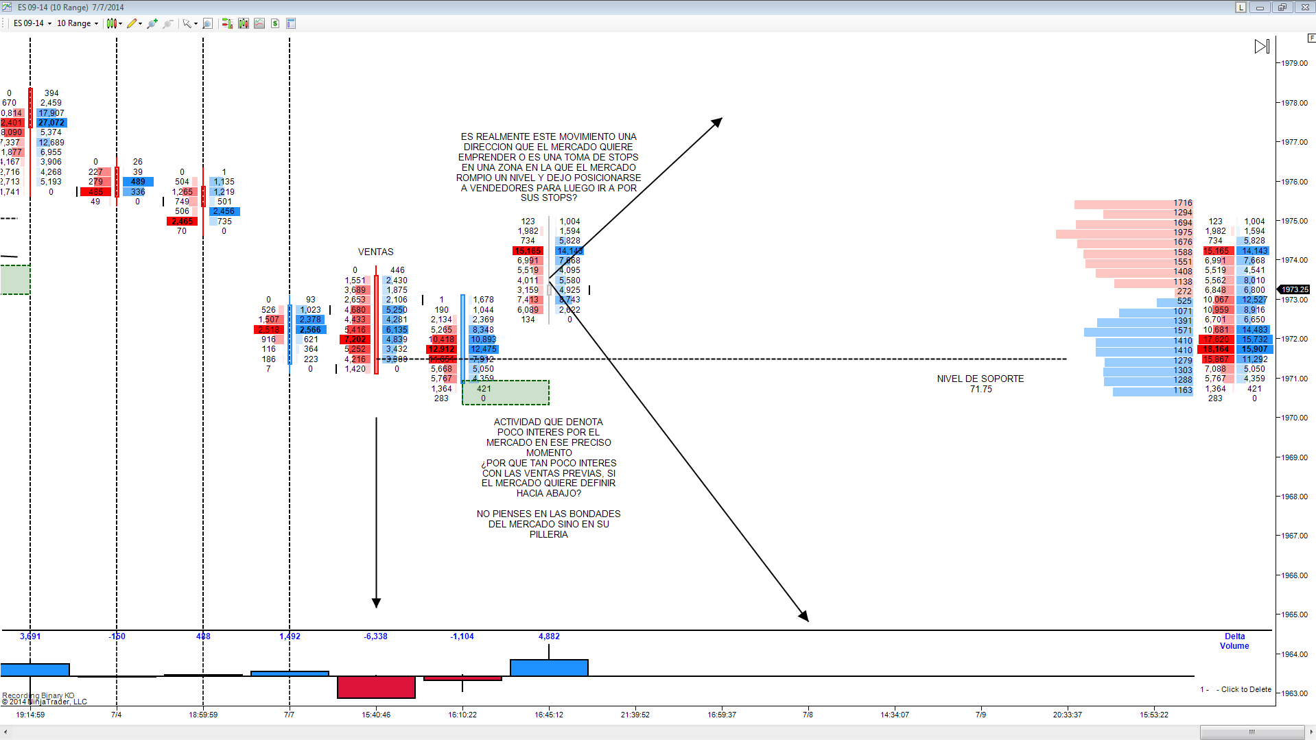 Creo que no estamos hablando de pretender una curva de precios limpia completamente, algo de ruido debe haber. Las barridas de stops son lo más leve a lo que creo nos referimos como algo agresor, e incluso dentro de una concepción de ondas, entran dentro de lo natural (1). Habrá barridas vamos a decir de estas, naturales, y otras frías y calculadas, de esas que tantean la sensibillidad del Mercado, o sea calculan con cuantos contratos van a poder absorber y vencer la resistencia de las órdenes limitadas. Pero a lo que nos referimos es a movimientos o detenciones del movimiento de algo de más entidad, creo yo.