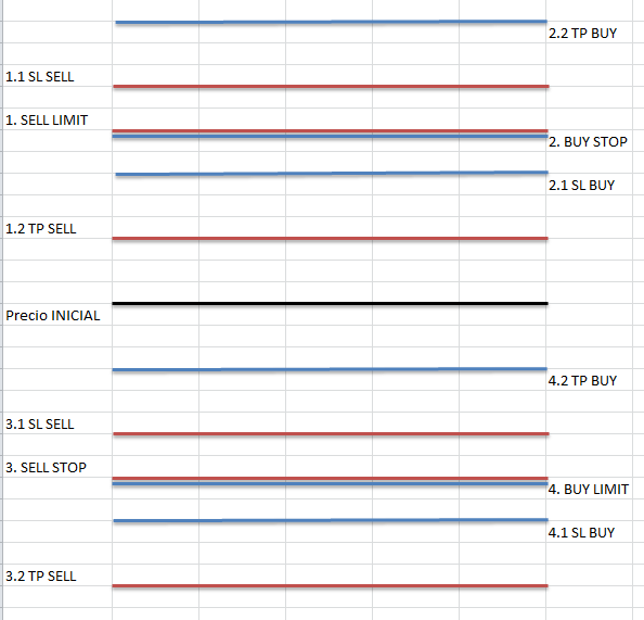 La parte inicial del mecanismo de la estrategia la entiendo. Pero cuando se dispara una orden no alcanzo a pillar como sigue... Hay veces que la estructura se repite, aunque más alejada, otras veces aparecen las ordenes limit y stop distanciadas... alguien puede explicarme como sigue???
