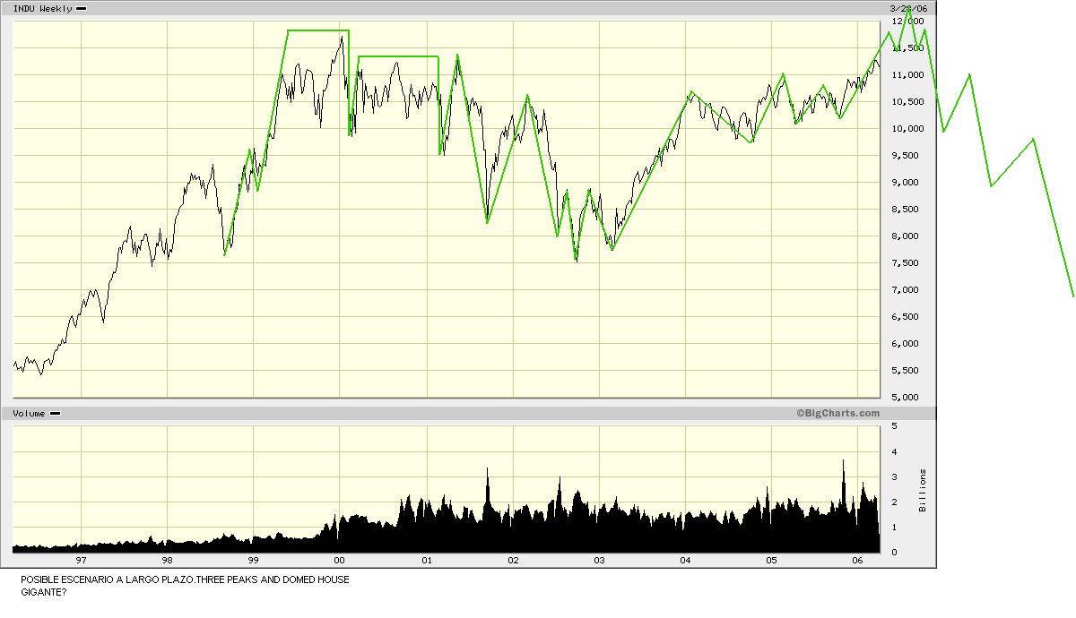 A corto plazo el mercado creo que intentara un nuevo rally de cerca del 10% y despues podria iniciar un mercado del oso importante.Los mercados suelen hacer techo en momentos distintos,en la anterior burbuja el techo del dow fue en enero 2000,los mercados europeos y el nasdaq tardaron 2 meses mas y el sp500 incluso mas tiempo.Pienso que nuevamente el dow jones podria ser el primero en hacer techo,segun cristopher L.Carolan el calendario espiral señala un techo el 7 abril,segun el siderograph bradley el 11 abril es una posible fecha de giro para el dow,una ventana puetz se abrio el 7 marzo y se cerro el 17 marzo sin ninguna caida importante(hoy hay un eclipse solar,podriamos esperar a la primera luna llena despues del eclipse solar el 13 abril, para un posible techo),tambien tenemos una oposicion sol-jupiter el 4 de mayo(el dow puede tener una caida importante entre 15 dias antes de la oposicion o el mismo dia)algunas fechas pasadas fueron : 1-1-02/2-2-03/3-3-04/4-4-05/y la famosa 18-10-87,por ultimo la declinacion del nodo lunar a principios de abril.Quizas ninguna de estas razones sean exactas,pero en general nos estan indicando una posibilidad importante de un techo hacia finales de abril en el dow y con un mercado subiendo mas de 40 meses ese techo podria ser definitivo.