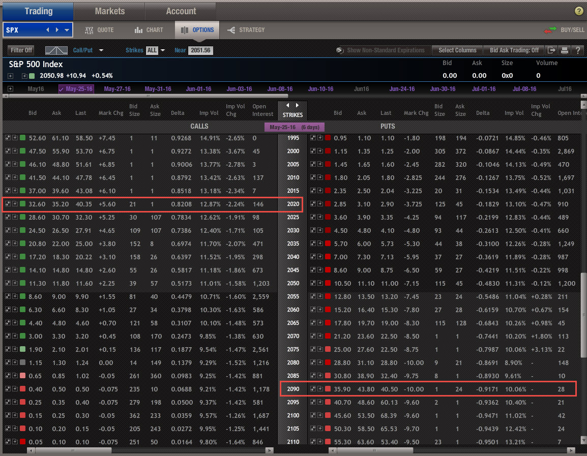 Y ésta es la cadena de opciones. He recuadrado las que voy a vender, una call en 2020 y una put en 2090 cotizando el índice en 2050,98: