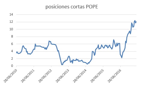 Tambien podemos ver aqui en el grafico la correlacion entre posiciones cortas y valoracion (precio) de las aciones de POPE - las pociciones cortas suben la quotizacion de POpe baja e vice versa