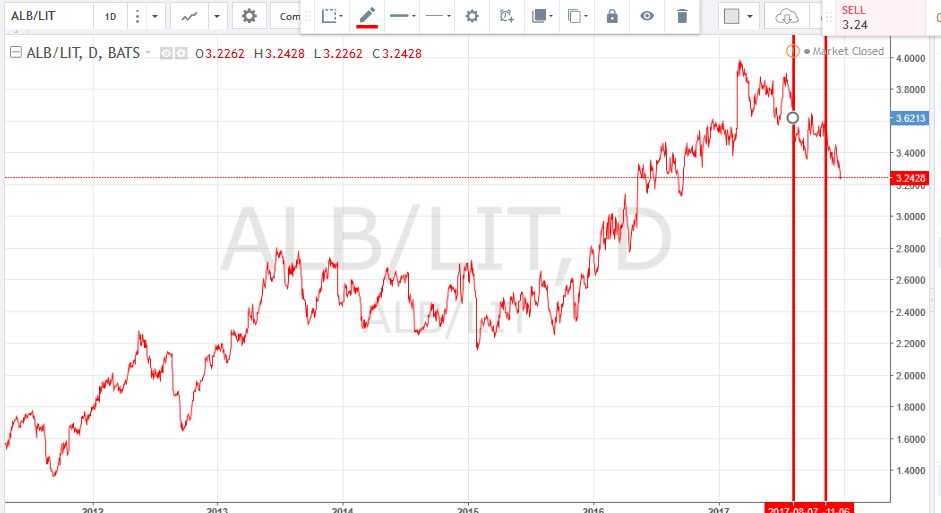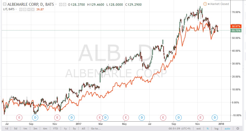 Este tipo de companhias (Albemarle) como su negocio es directamente associado al Lithio..quanto mas caro estea el lithio mas lucro tendra por esso su curva de precio será correlacionada al precio de lithio